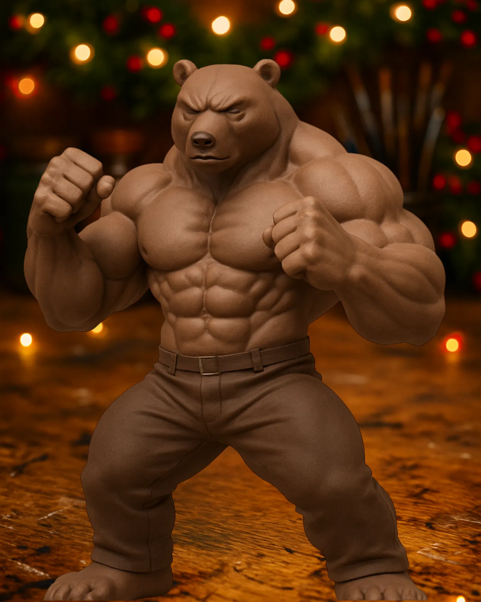 Một sinh vật kỳ ảo được in 3D, là tượng Gấu Cơ Bắp Chiến Binh. Sản phẩm này hoàn hảo cho những ai yêu thích mô hình nhân vật, trang trí nghệ thuật hoặc sưu tầm mô hình để bàn.