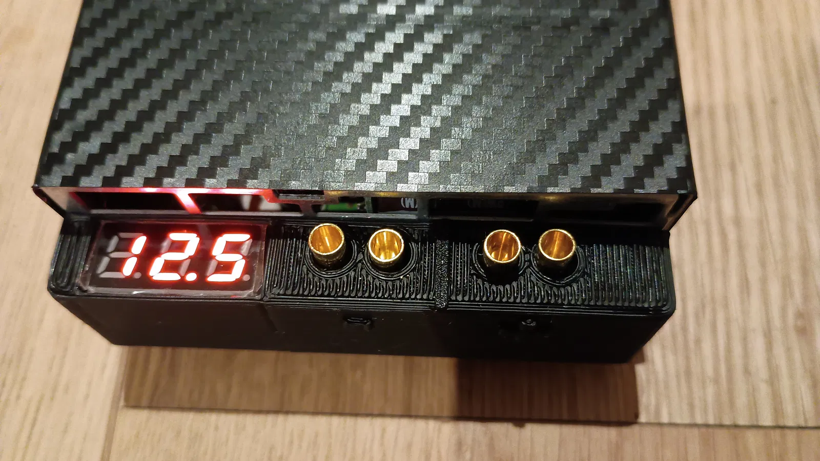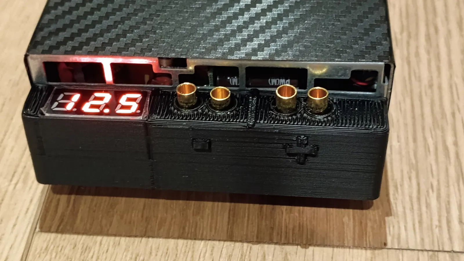 Nắp đậy cho đầu nối chân cắm của bộ nguồn máy chủ HP đã được chuyển đổi thành bộ nguồn 12V cho xe RC đua. Sử dụng một vôn kế rẻ tiền dài 25mm, một điện trở 1K giữa chân 33 & 36, và 4 đầu nối tròn 4mm được hàn vào vị trí thích hợp để khớp với các lỗ trên nắp.