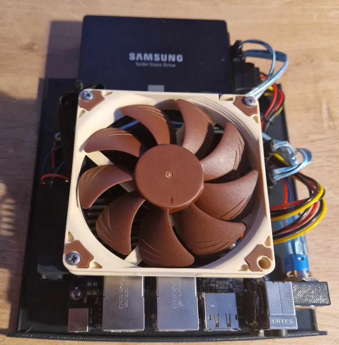 Mục tiêu là tạo ra một sled phù hợp với Odroid gắn quạt trong không quá 2U. Vì vậy, phần đế được ép để cho phép luồng không khí và lắp đặt thấp hơn. 2 SSD được gắn ở phía sau.