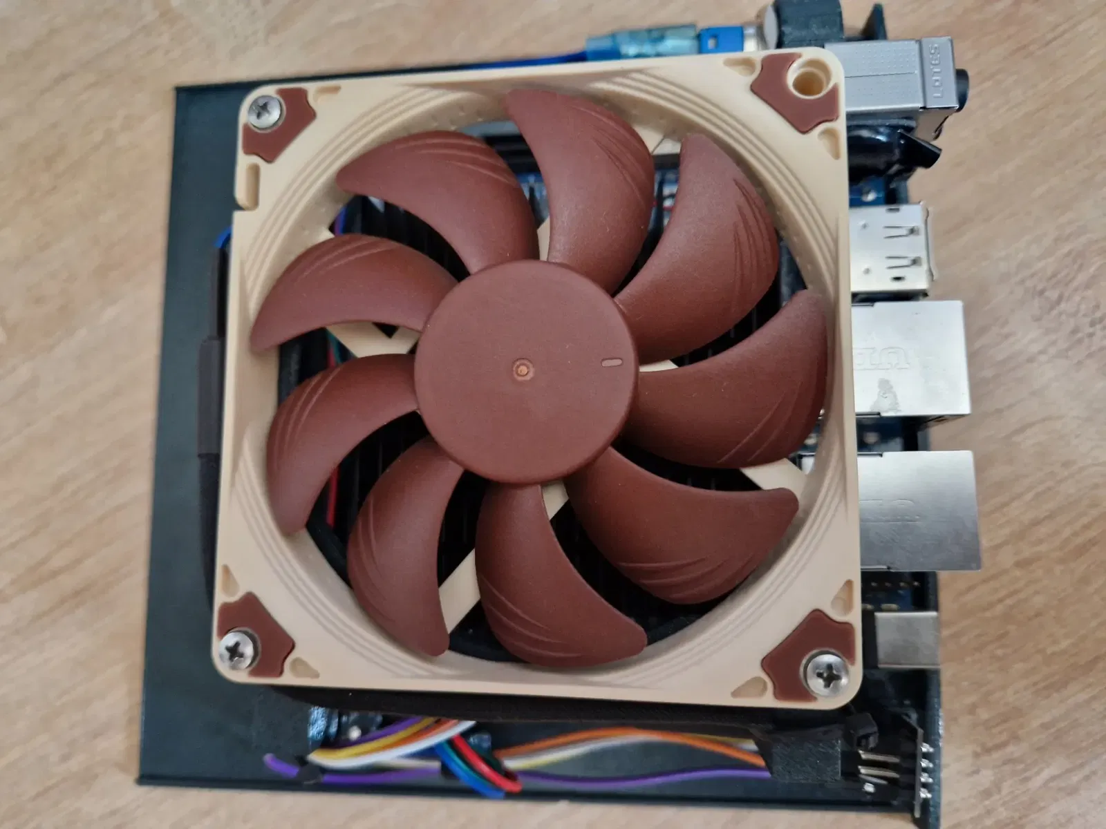 Giá gắn quạt tùy chọn được thiết kế cho quạt 92x92 mm. Quạt trong ảnh là Noctua NF-A9x14. Đây là một quạt có thiết kế thấp giúp giữ cho toàn bộ bên trong rack dưới 2U.