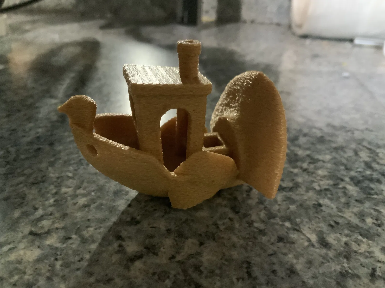 Con thuyền benchy với phần đầu, cánh và lông đuôi giống gà tây. Nên sử dụng supports và tăng độ bám dính của bed in.