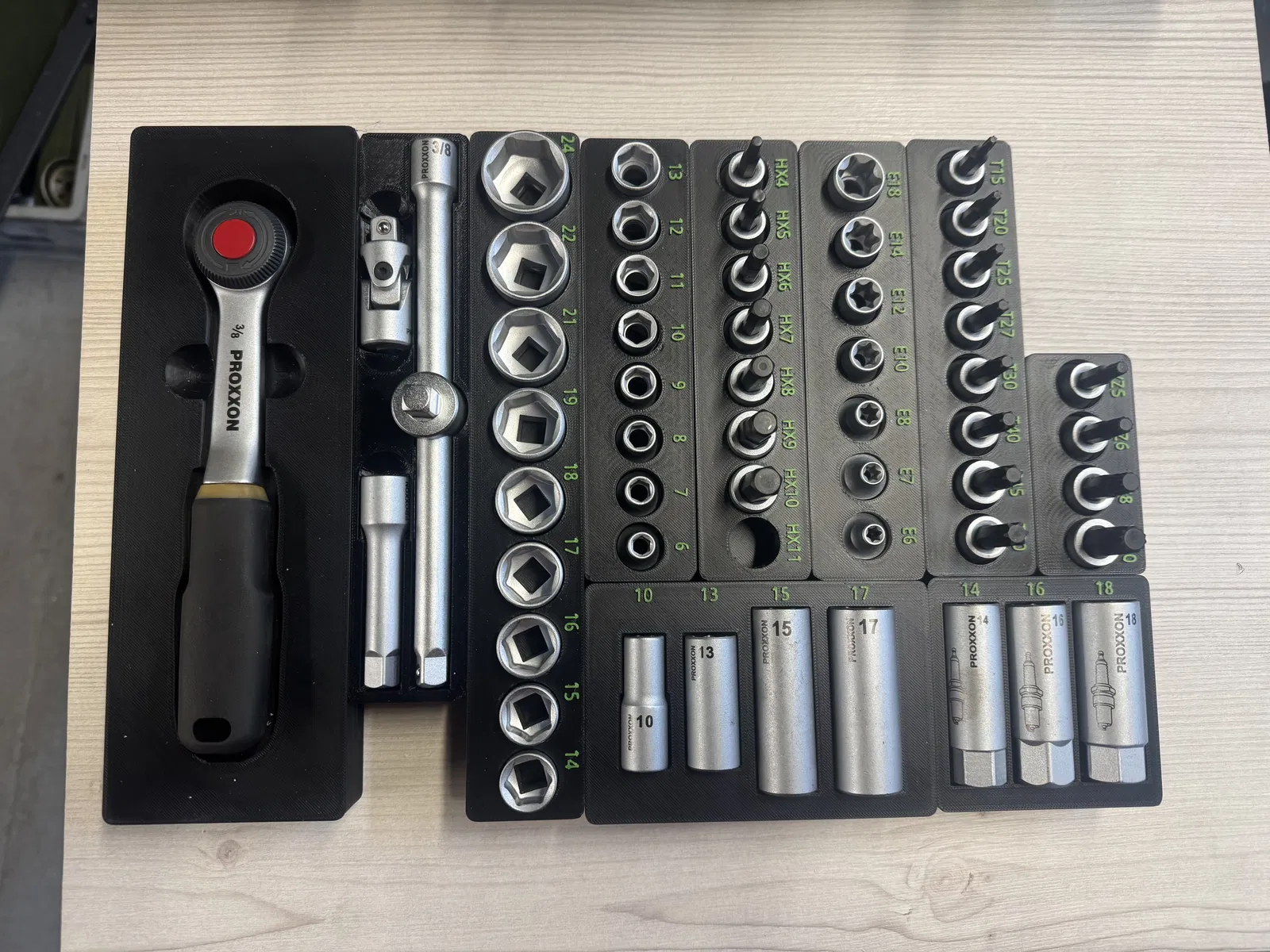 Tao làm ra mấy cái hộp đựng đồ theo chuẩn Gridfinity cho bộ Cờ lê & đầu tuýp Proxxon 23112 - 3/8 nè.