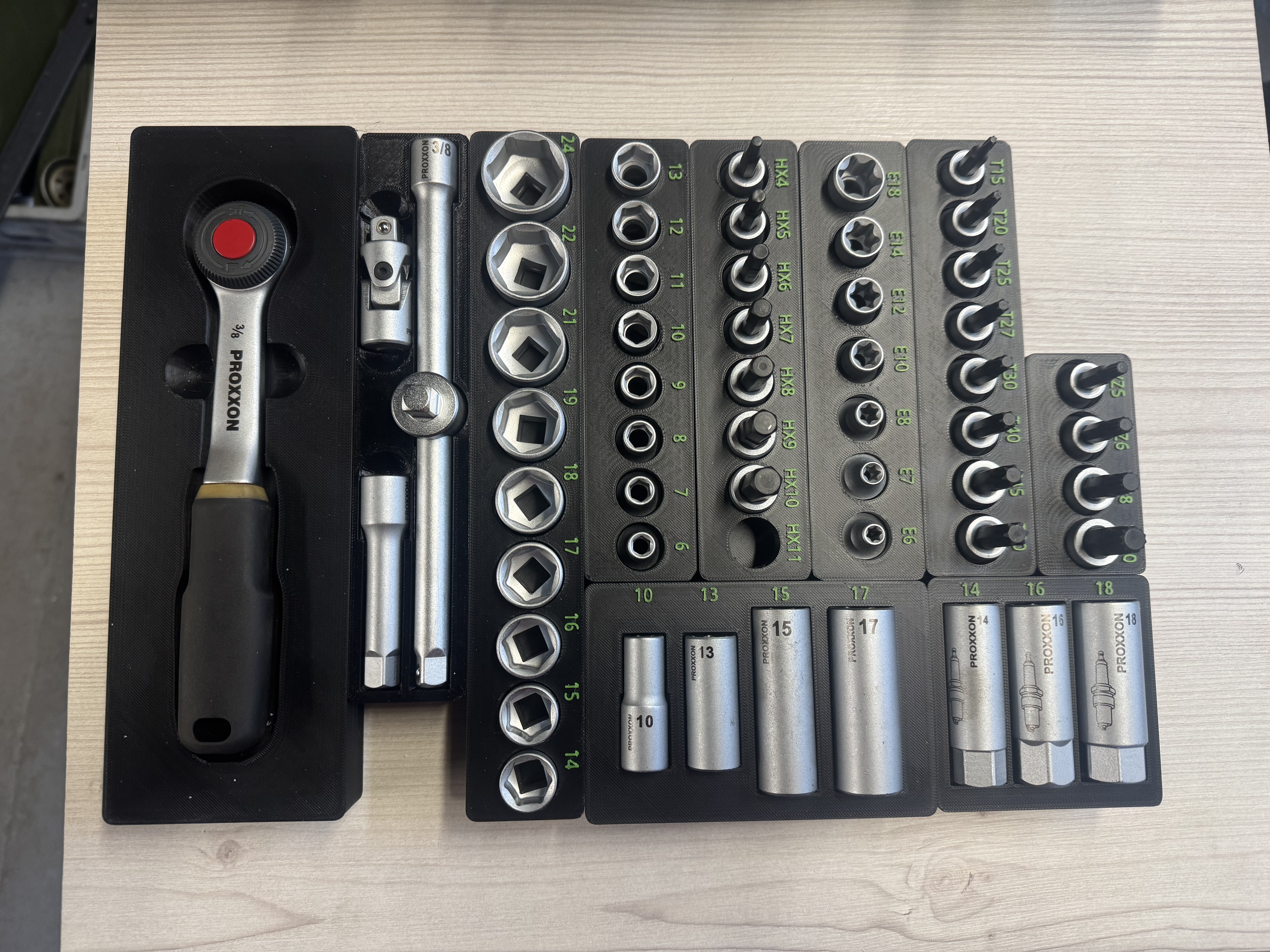 Dùng hộp đựng Gridfinity để sắp xếp bộ Cờ lê & đầu tuýp Proxxon 23112 - 3/8. Các hộp có chiều cao 3cm đồng đều, giúp xe đẩy dụng cụ thêm gọn gàng. Khuyến khích dùng PETG hoặc ABS để in.