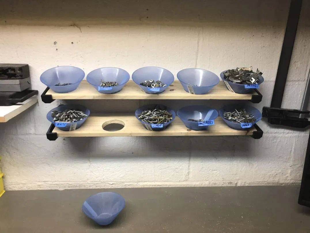 Giá đỡ kệ để giữ một mảnh gỗ ở độ nghiêng xuống 15 độ, vì vậy nếu bạn có thể thấy những gì trong các thùng chứa trên đó.