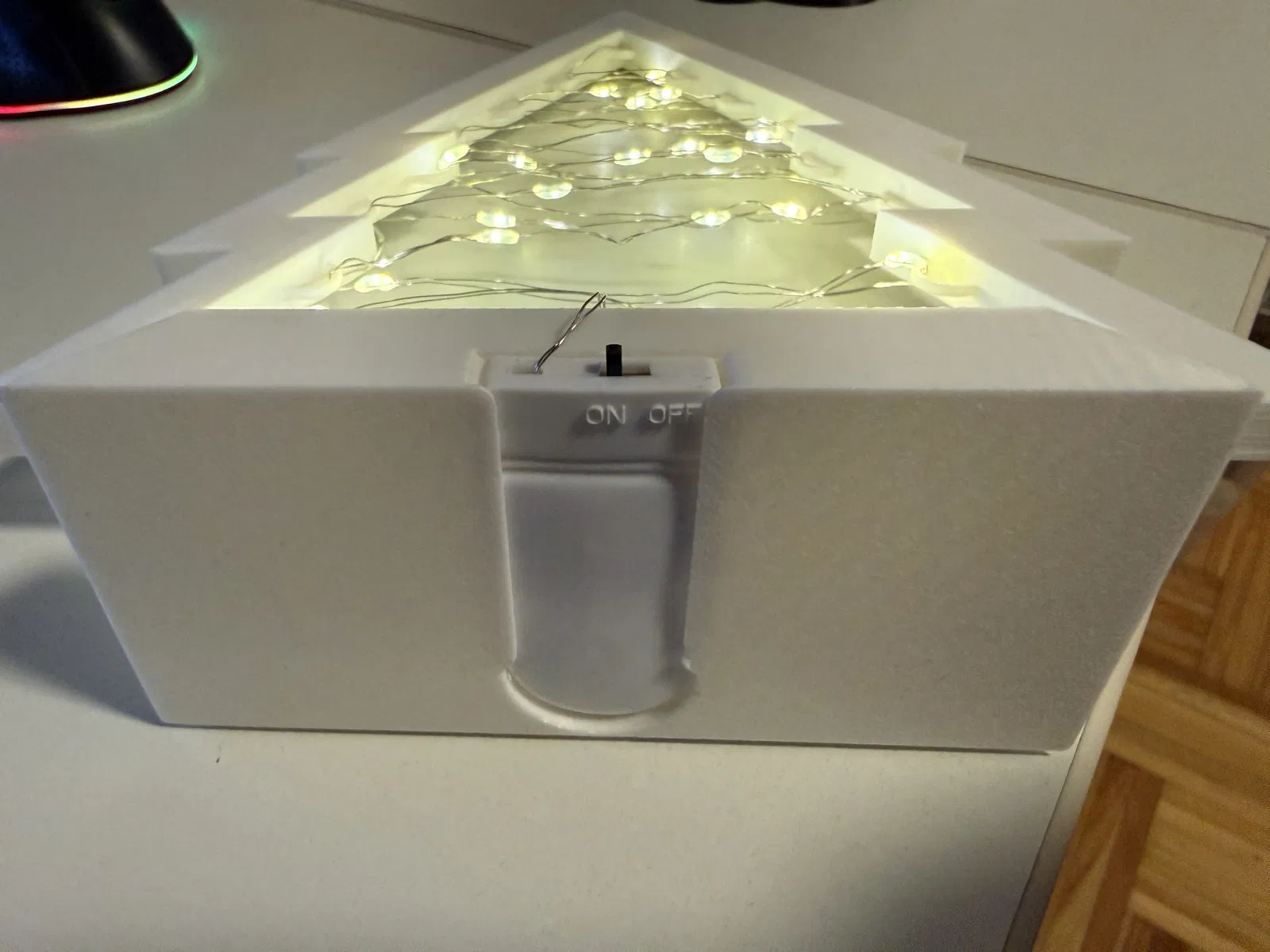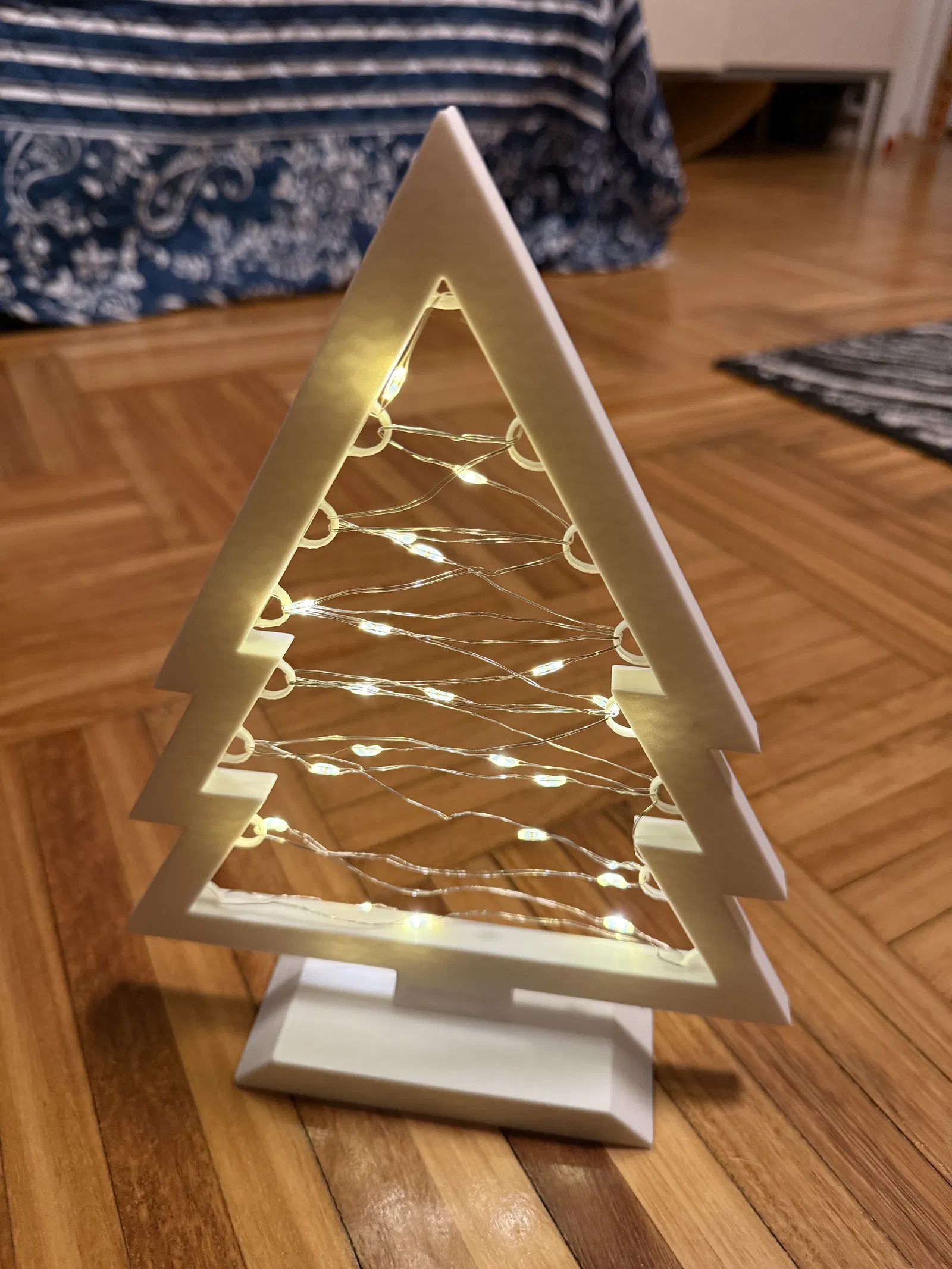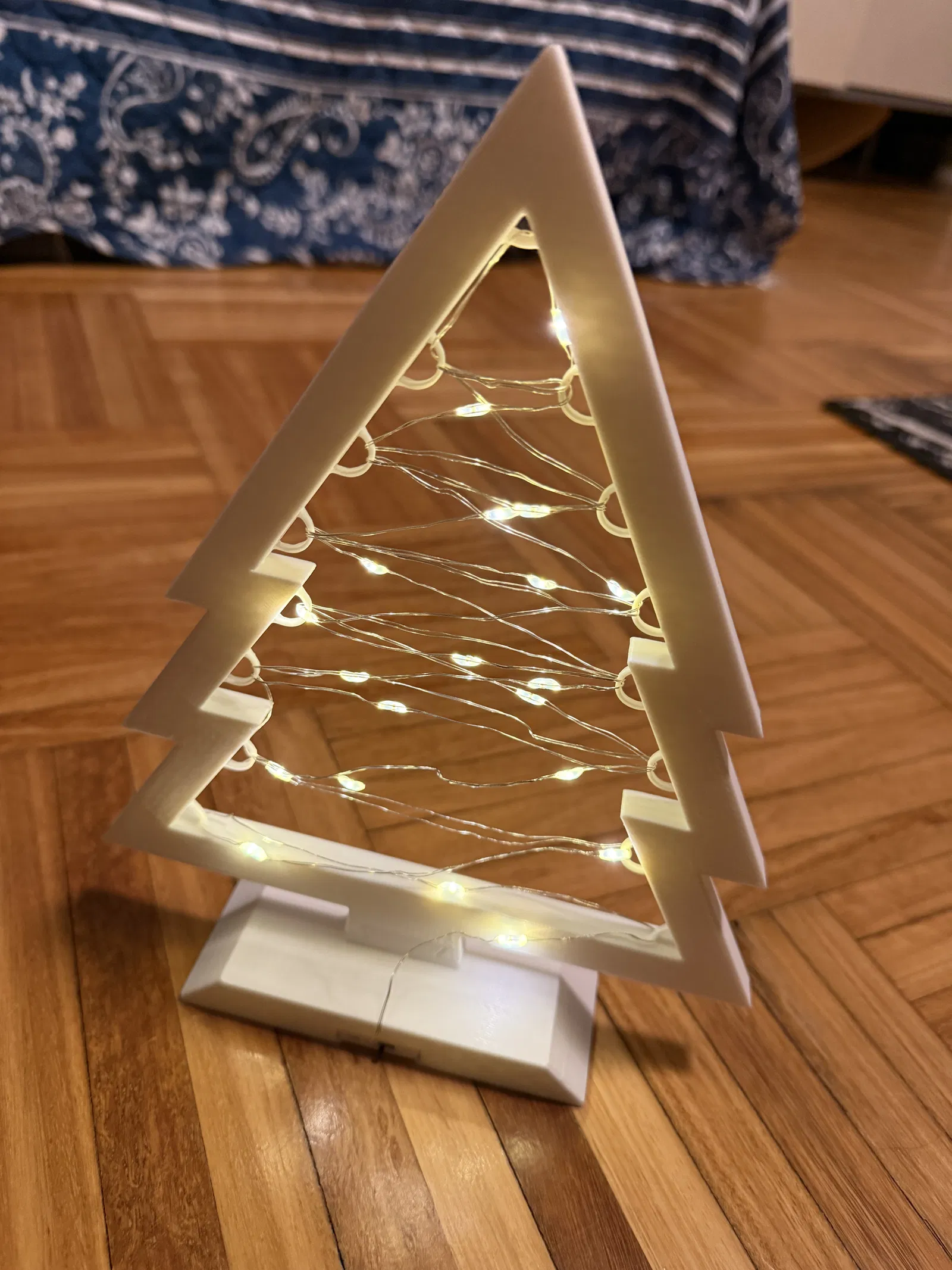 Mô hình cây thông Noel được thiết kế với các vòng sẵn có để bạn dễ dàng luồn dây đèn trang trí. Phần đế có khoang chứa pin vừa vặn cho đèn dây BXROIU LED, mua từ Amazon. Thích hợp để trang trí cho mùa Giáng Sinh thêm lung linh.