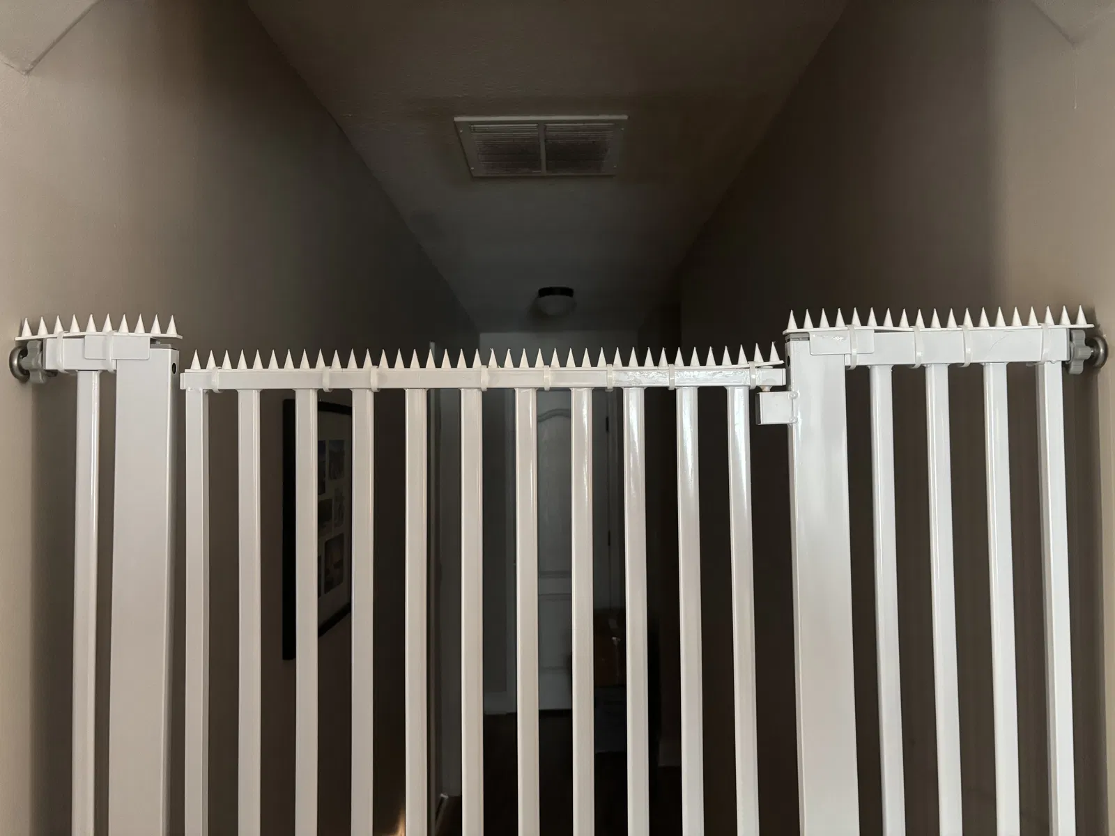 Đây là một dải gai hình nón đơn giản dài 6 inch để gắn lên đỉnh cổng/chắn cho thú cưng, đặc biệt là những bé nhanh nhẹn. Dải gai này có cạnh sắc, nhưng góc của hình nón khá dốc nên nó chỉ có tác dụng ngăn cản thú cưng chứ không làm chúng bị thương. Tôi đã mài nhọn các đầu gai một chút để chúng gây khó chịu nhưng không gây hại.