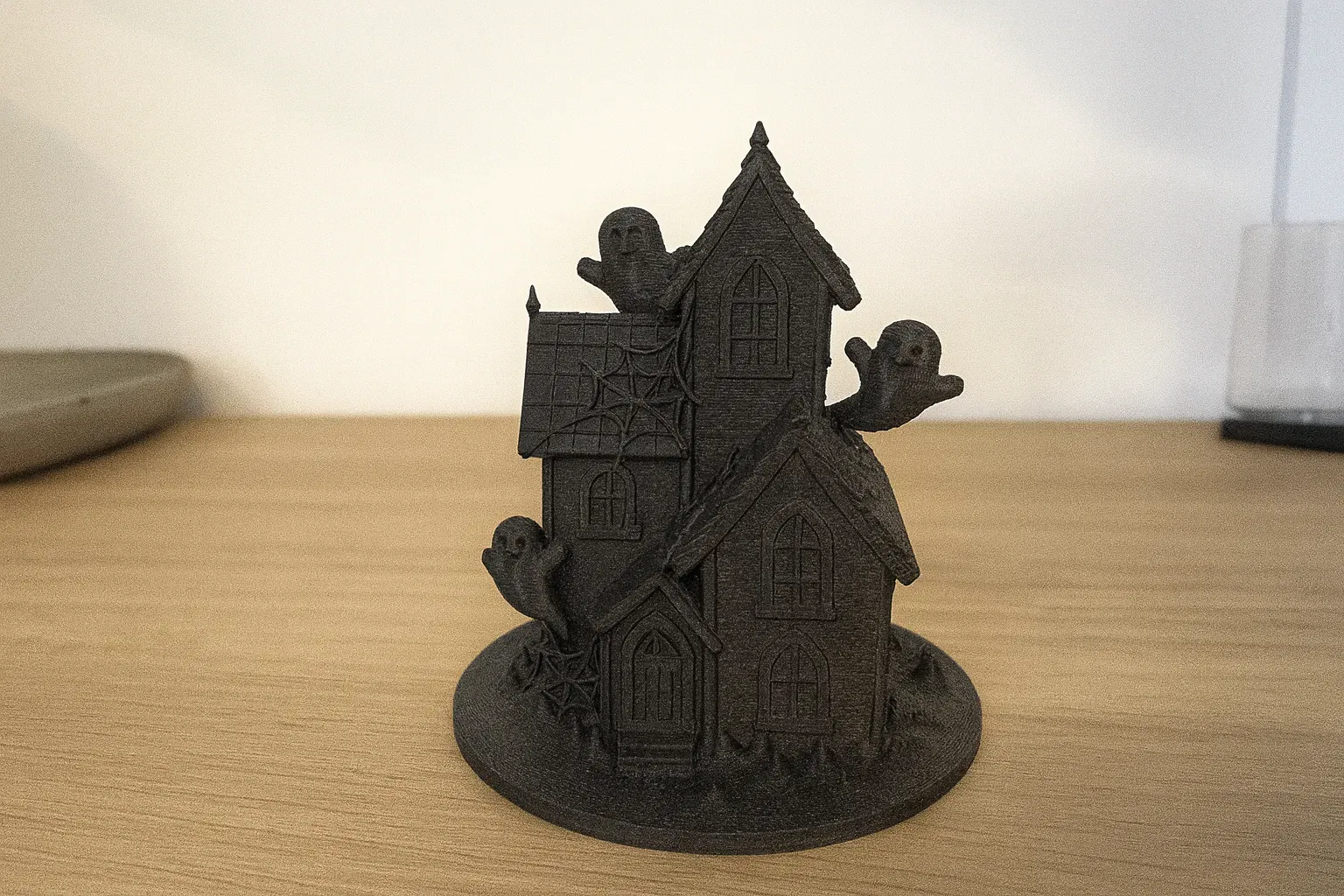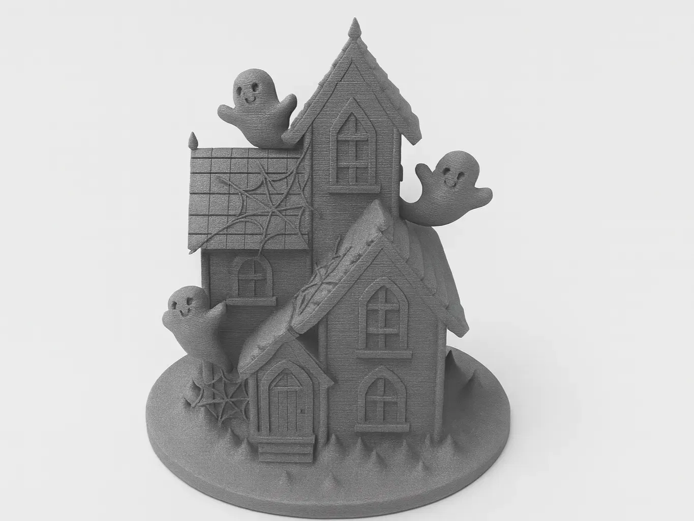 Ngôi nhà ma ám này trông vừa dễ thương vừa ma quái ghê! Mấy con ma nhỏ lơ lửng trên mái nhà làm nó trông tinh nghịch hơn là đáng sợ. Kích thước 60x60x63mm, in bằng nozzle 0.4mm, mọi chi tiết đều sắc nét.