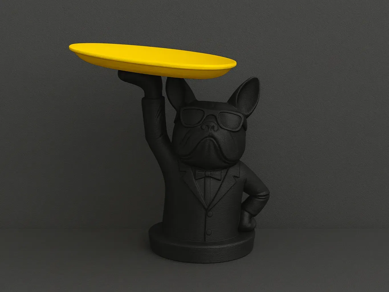 Chú bulldog phong cách trong bộ suit, cầm đĩa vàng tươi như quản gia hoàn hảo. Vừa sang trọng vừa láu lỉnh, mẫu in thu hút ngay. Thích hợp làm đồ trang trí bàn làm việc, khay đựng tiền xu, mang lại nụ cười.
