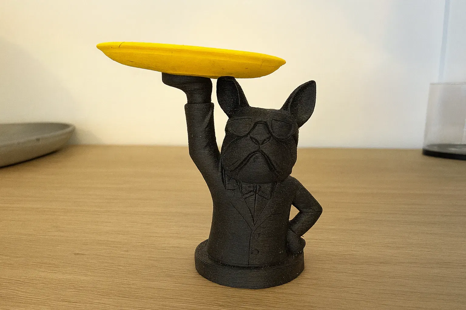Một chú bulldog cực kỳ phong cách trong bộ suit, đang cầm một cái đĩa màu vàng tươi rói như một người quản gia nhỏ xíu hoàn hảo. Vừa sang trọng mà lại hơi láu lỉnh một chút — là cái mẫu in mà nhìn là thấy thu hút liền à. Tui in bằng máy Bambu Lab A1 Mini với AMS, kích thước 48x36x50mm. Mẫu này để trên bàn làm việc, làm khay đựng tiền xu, hay đơn giản là một món đồ trang trí vui vẻ làm anh em cười là hết bài.