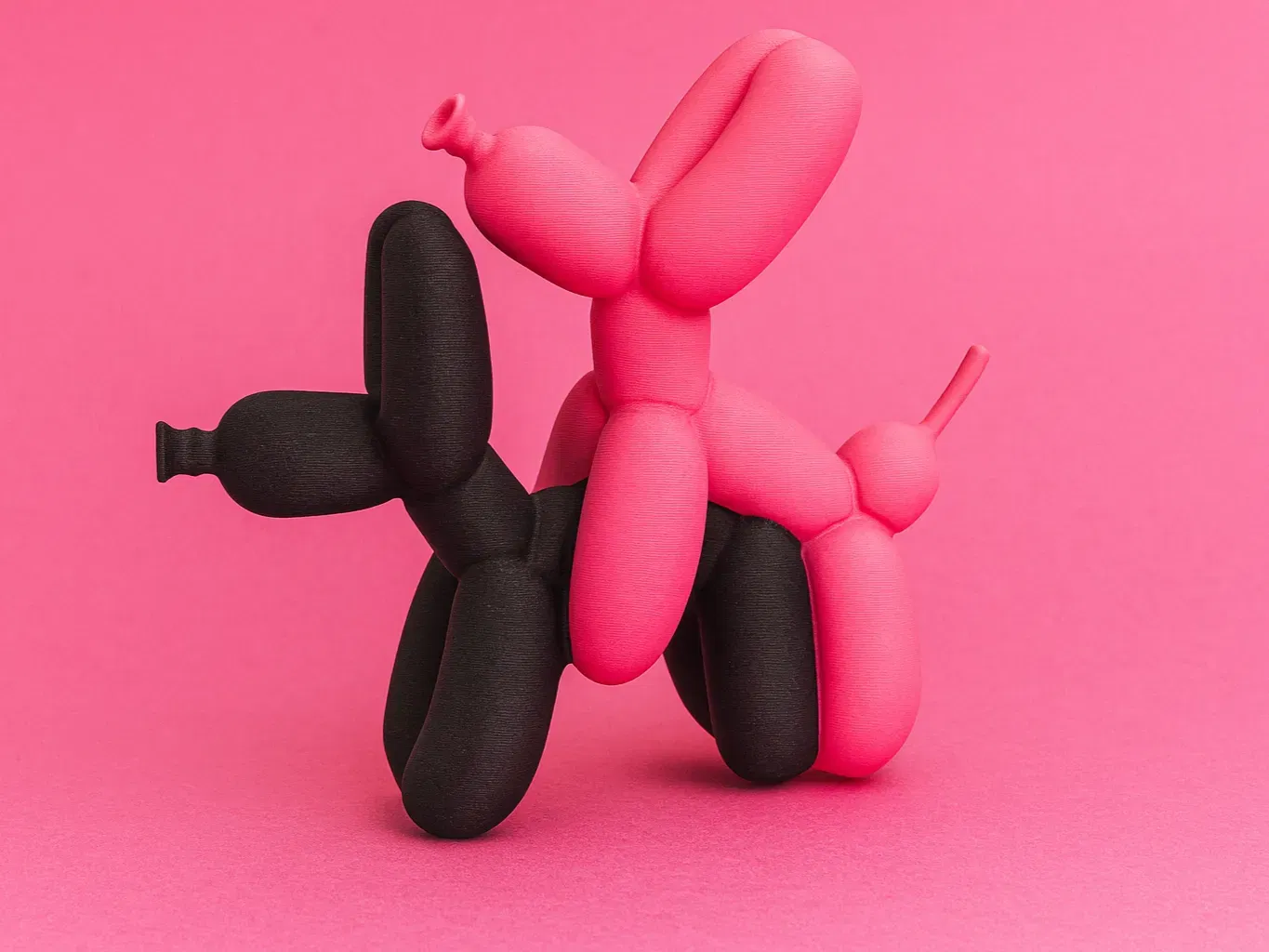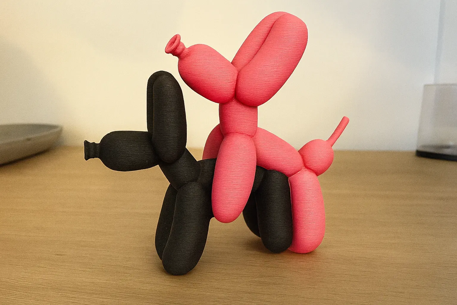 Hai chú chó bong bóng đứng tạo dáng tinh nghịch — một chú màu đen, một chú màu hồng tươi. Tác phẩm vui nhộn và bắt mắt này được in trên máy Bambu Lab A1 Mini với AMS đa sắc, kích thước 58x21x55mm. Hoàn hảo để đặt trên bàn làm việc, kệ sách, hoặc làm quà tặng độc đáo cho người có khiếu hài hước.