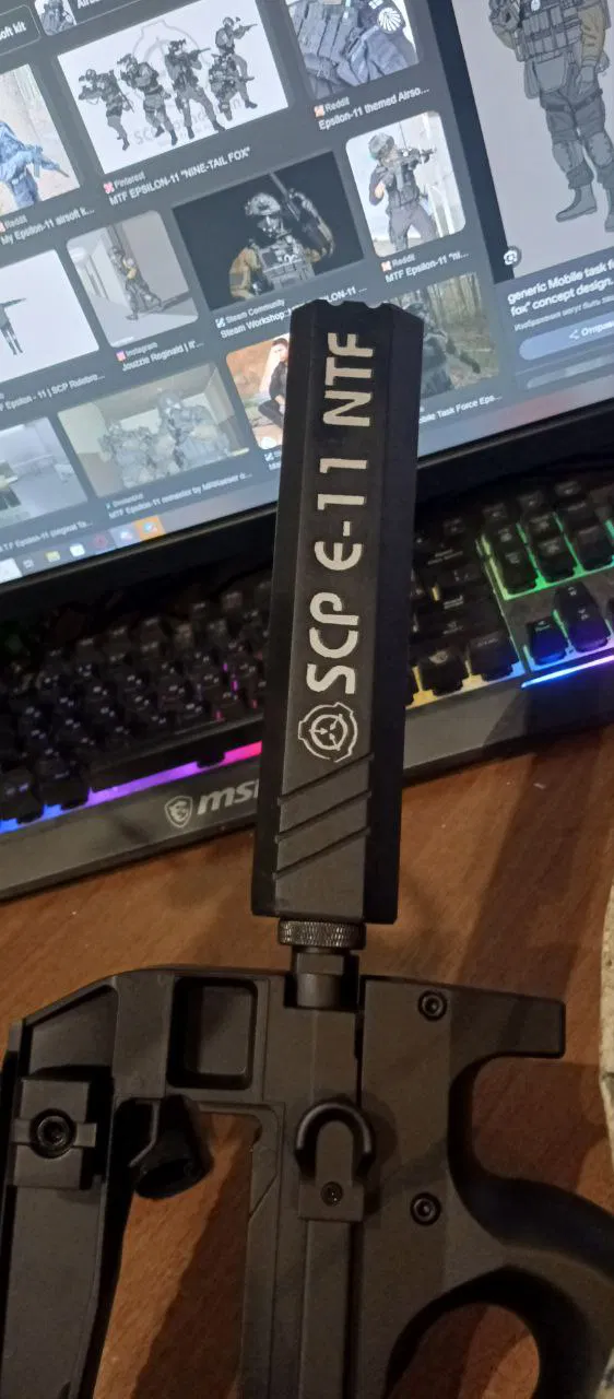 Ống giảm thanh FN P90 cho CYMA. Một ống giảm thanh đơn giản, được thiết kế lại cho FN P90. Ren xoắn M14 ren ngược (trái). Có hai mẫu: một trống và một có dấu SCP E-11 NTF. In bằng PLA với máy Flyingbear Aone 2.