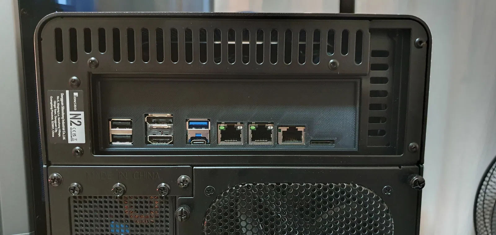 Đây là tấm chắn IO cho bo mạch chủ NAS Topton N100, 2x2.5G và 1x10G từ Aliexpress. Tấm chắn che một phần cổng HDMI/DisplayPort nhưng không làm chặn nó.