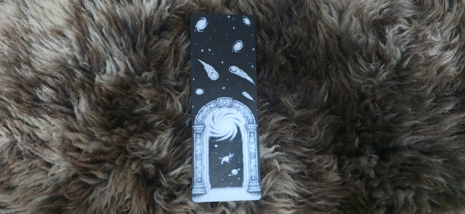 Chiếc bookmark độc đáo này mô phỏng cổng đá dẫn lối vào dải ngân hà xoắn ốc, với các chi tiết phi hành gia, hành tinh và sao chổi trên nền đen trắng. Hoàn hảo cho fan fantasy, sci-fi và kiến trúc vũ trụ.