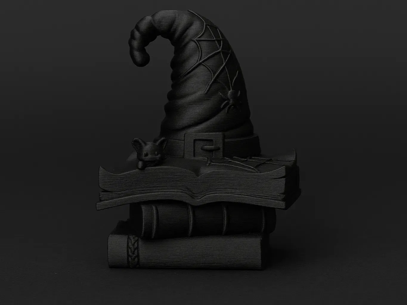 Một chút phép thuật Halloween nhỏ xinh – chiếc nón phù thủy xiêu vẹo đặt trên chồng sách phép thuật, kèm theo mạng nhện và một chú dơi nhỏ. In trên máy Bambu Lab A1 Mini màu đen bóng bẩy. Đây là món đồ trang trí ma quái hoàn hảo hoặc một món quà thú vị cho bất kỳ fan nào yêu thích giả tưởng và phép thuật.