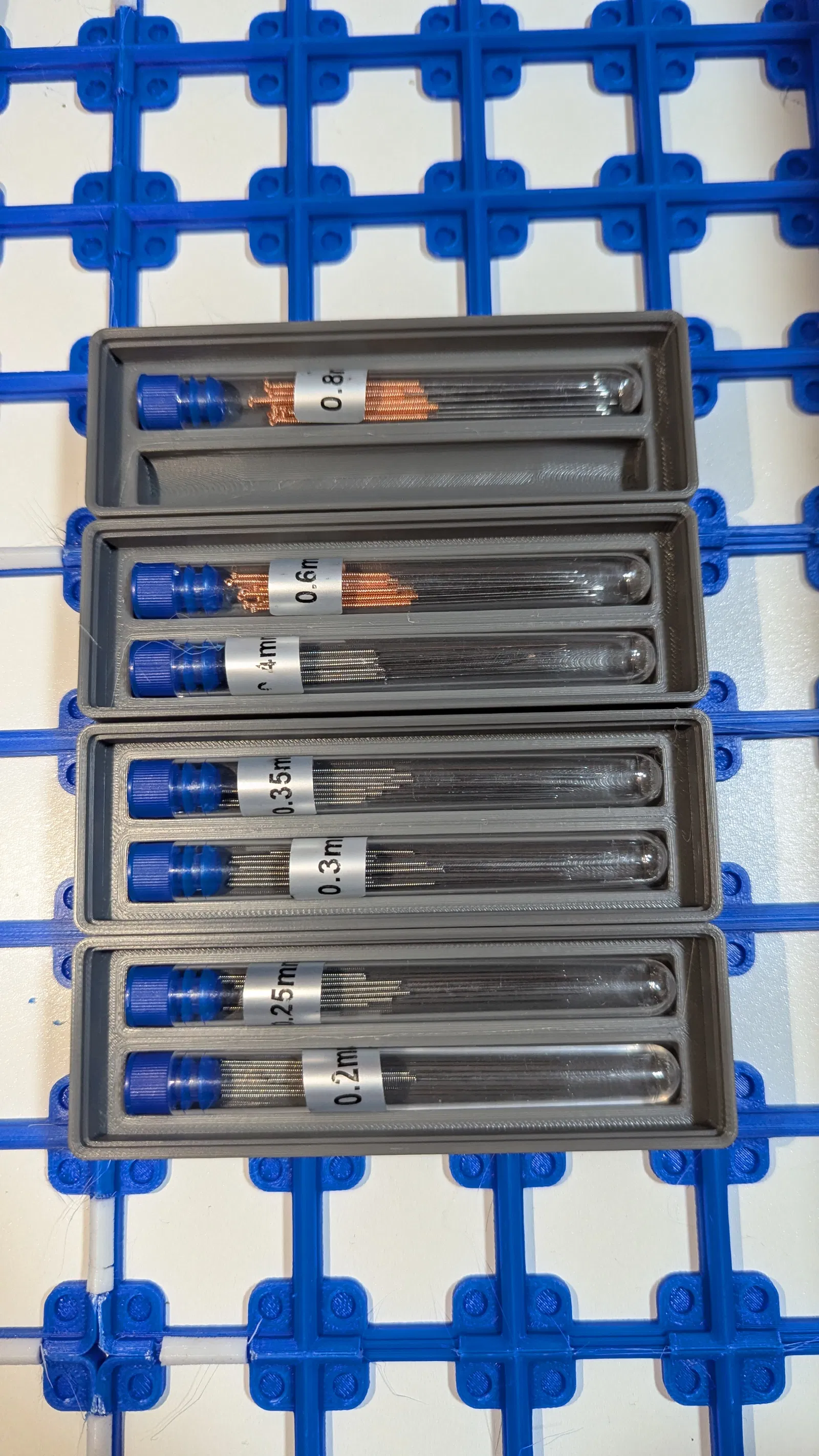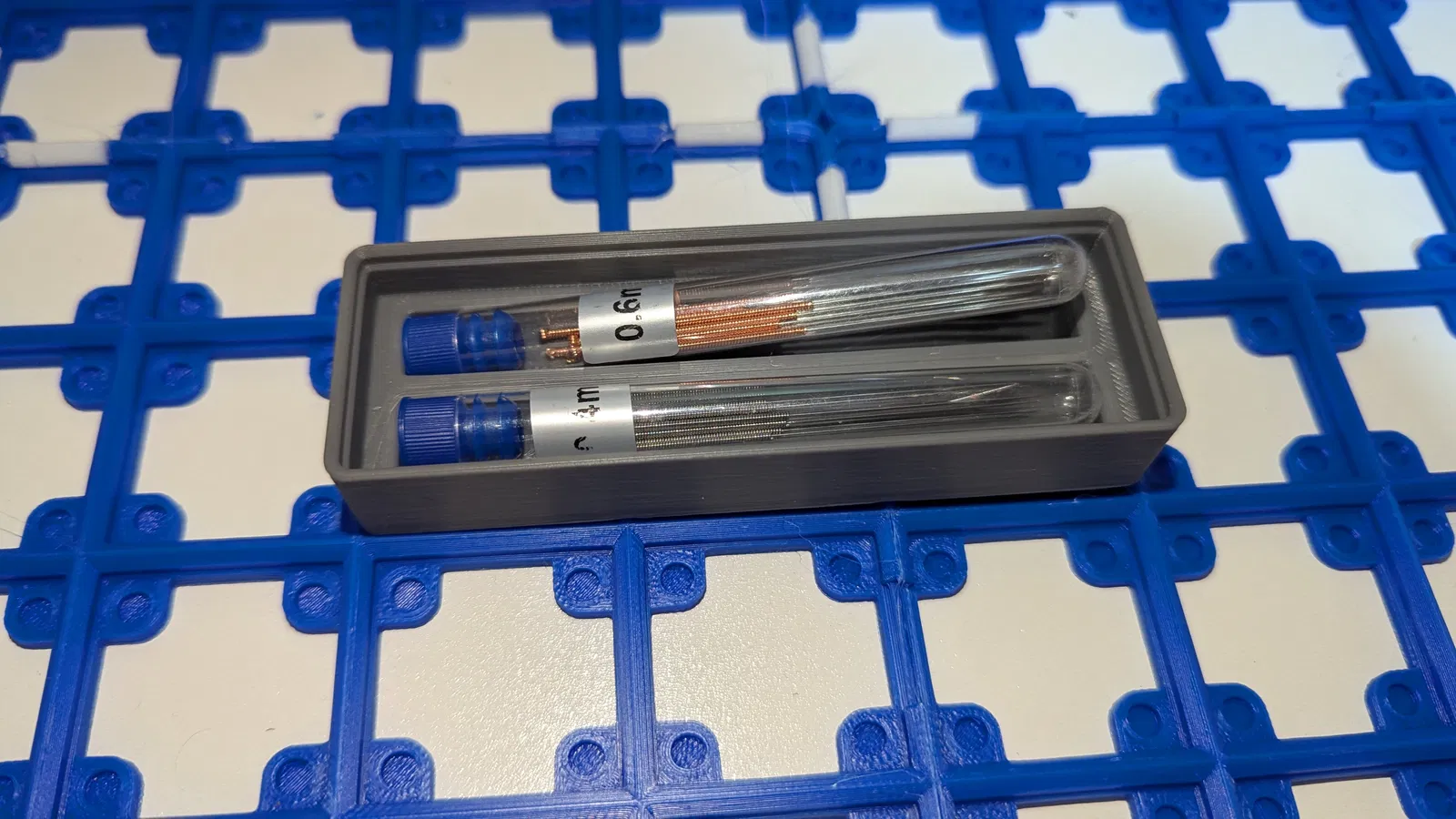 Hộp đựng nhỏ gọn cho ống kim vệ sinh đầu phun theo chuẩn Gridfinity. Mỗi hộp chứa được 2 ống, có thể xếp chồng và dễ dàng lấy ra nhờ thiết kế thông minh ở hai đầu.