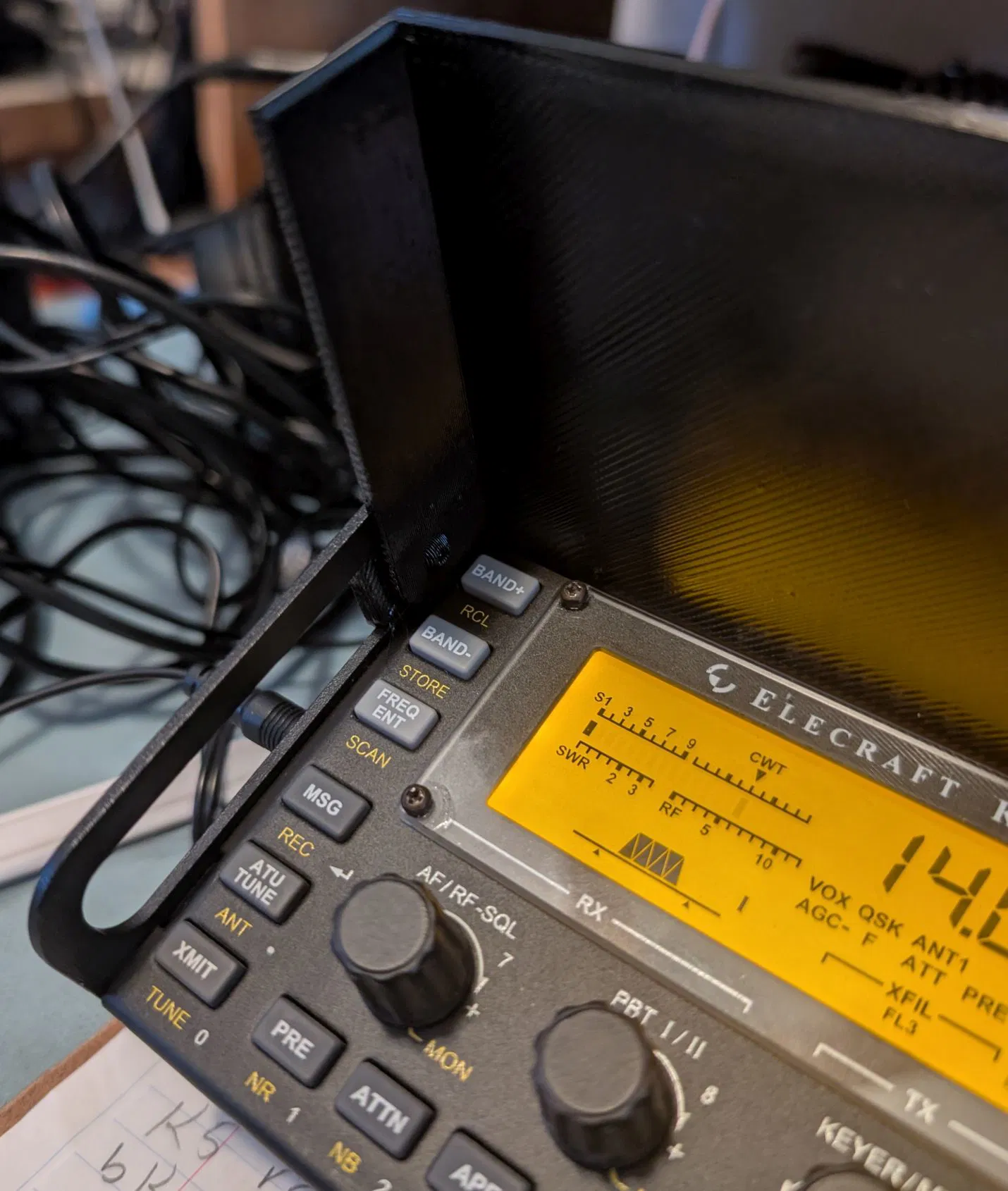 Tấm che nắng cho KX3, gắn vào thanh ray bên hông và gập xuống để bảo vệ màn hình và các nút điều khiển. Được thiết kế bằng OpenSCAD và in bằng PETG. Lắp ráp bằng 2 vít M3x8, độ ma sát có thể điều chỉnh bằng cách siết ốc.