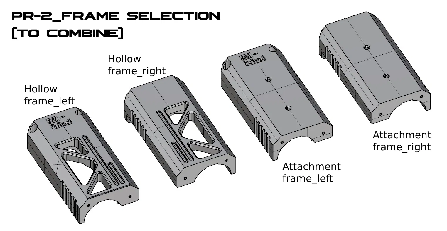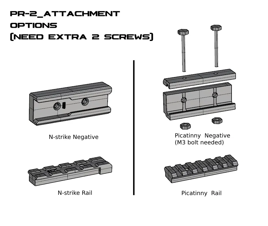 mấy cái miếng "attachment frame" này cho phép mấy bồ bắt ốc mấy cái thanh ray vô PR-2 và kết hợp với mấy khẩu Nerf hay phụ kiện khác. Mấy bồ cũng có thể ghép mấy cái khung lại theo ý thích, nên có thể gắn nhiều PR-2 lại với nhau hoặc làm mấy cái chế tạo ngu ngốc khác. Tui chưa test thử với bộ phận bên trong của Micro 2.0 coi có tương thích không.