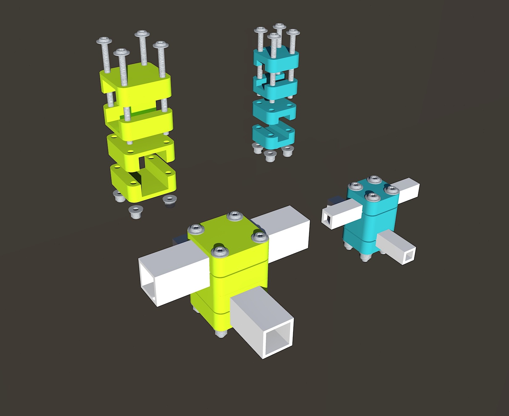 Dùng để nối các ống vuông 10mm hoặc 20mm lại với nhau một cách chắc chắn, dùng để làm kệ hoặc các công trình khác. Có hướng dẫn chi tiết về ốc vít, in ấn và lắp ráp.