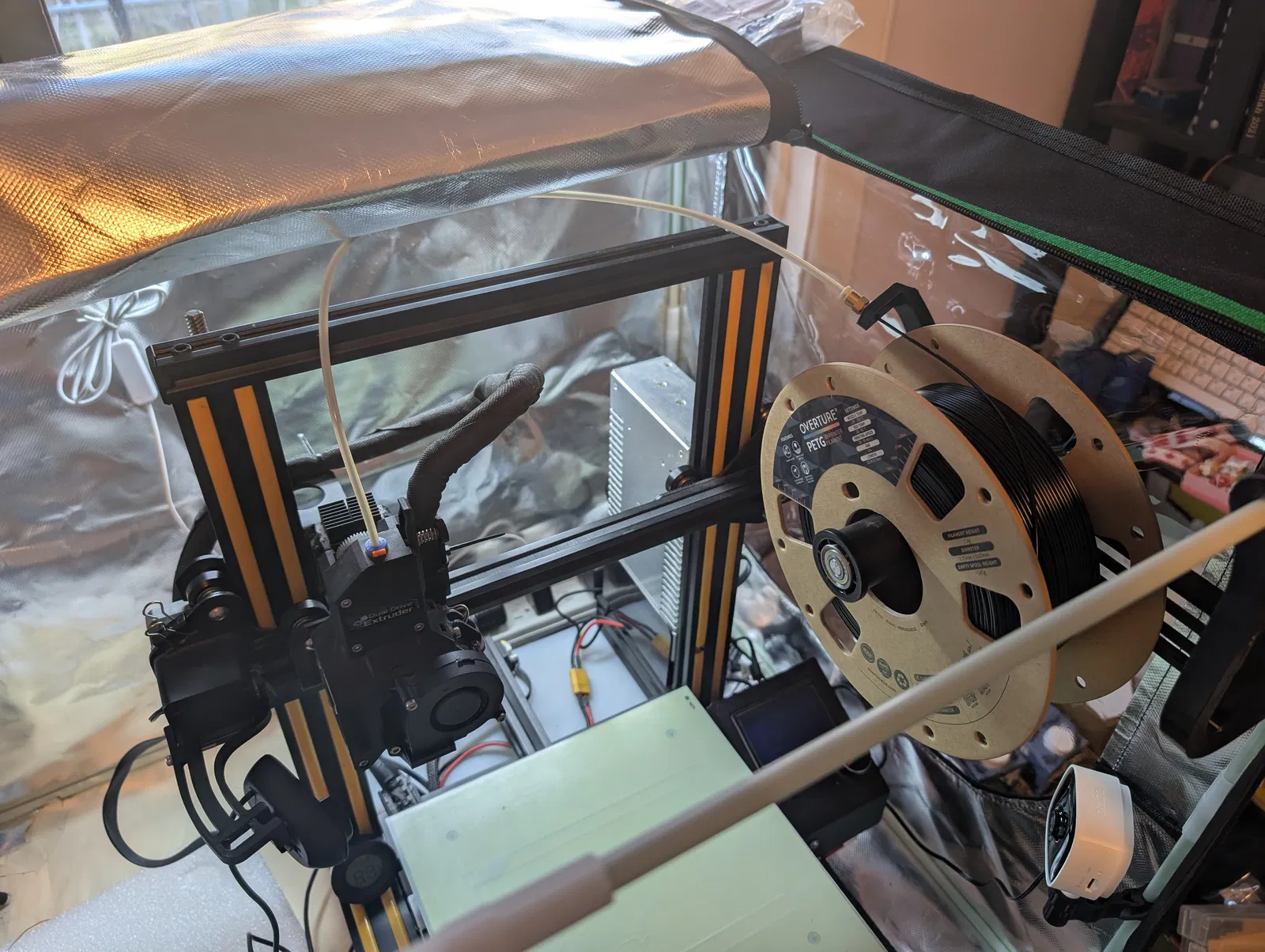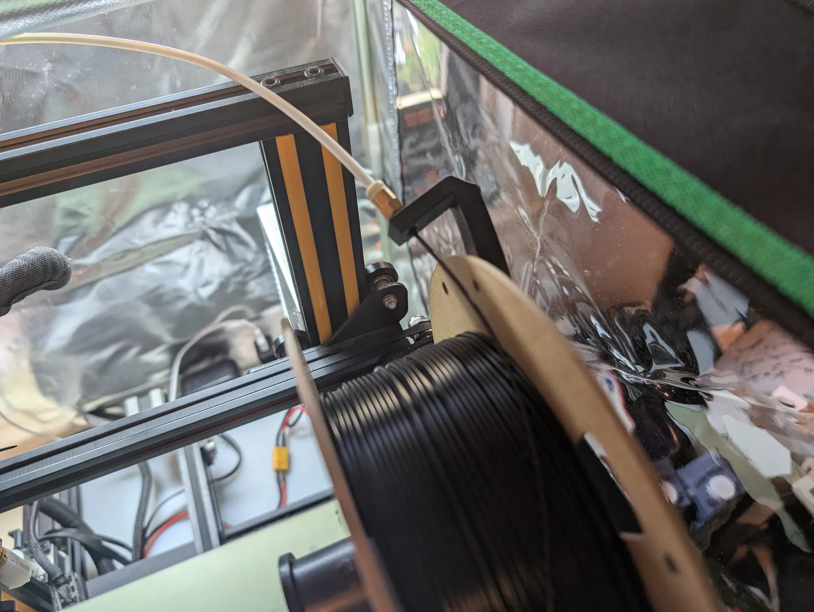 Tui cần một cái dẫn dây tóc (filament guide) gọn gàng cho cái đế cuộn dây của tui trong cái lều/hộp kín (enclosure) theo kiểu lều, và tui nghĩ có thể gắn cái bộ bowden ngược (reverse bowden) trực tiếp lên đế cuộn dây của tui, tui đã tạo cái này để nó nhô ra từ khoảng trên đỉnh của cuộn dây.
