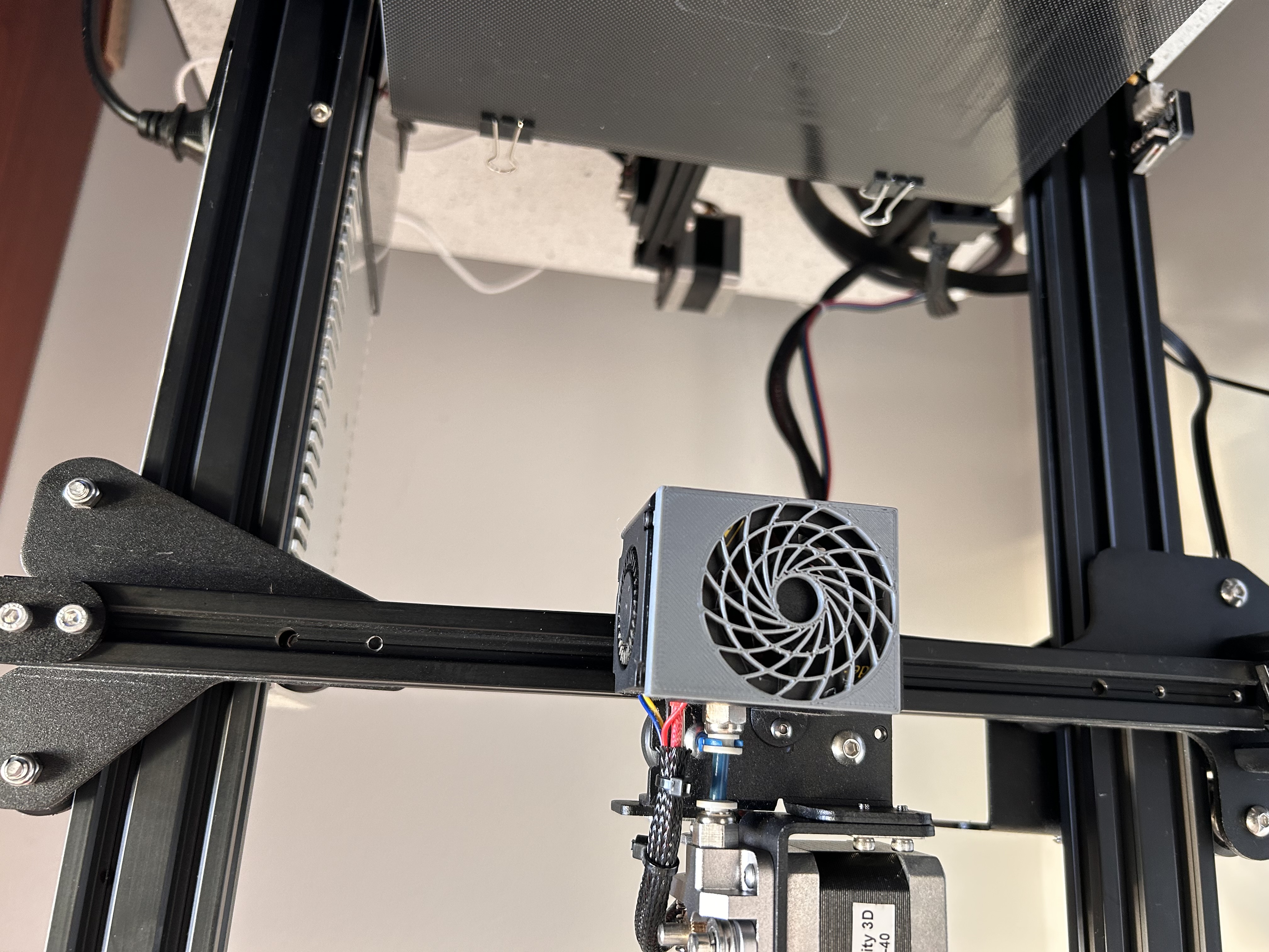 Cái lưới quạt zin bị chỉnh sửa lại để xài lưới quạt của Noctua High-Efficiency Fan Grill đó. Lý thuyết là cái này sẽ giảm được tiếng ồn của quạt làm mát đầu đùn khoảng ~2dB(A).
