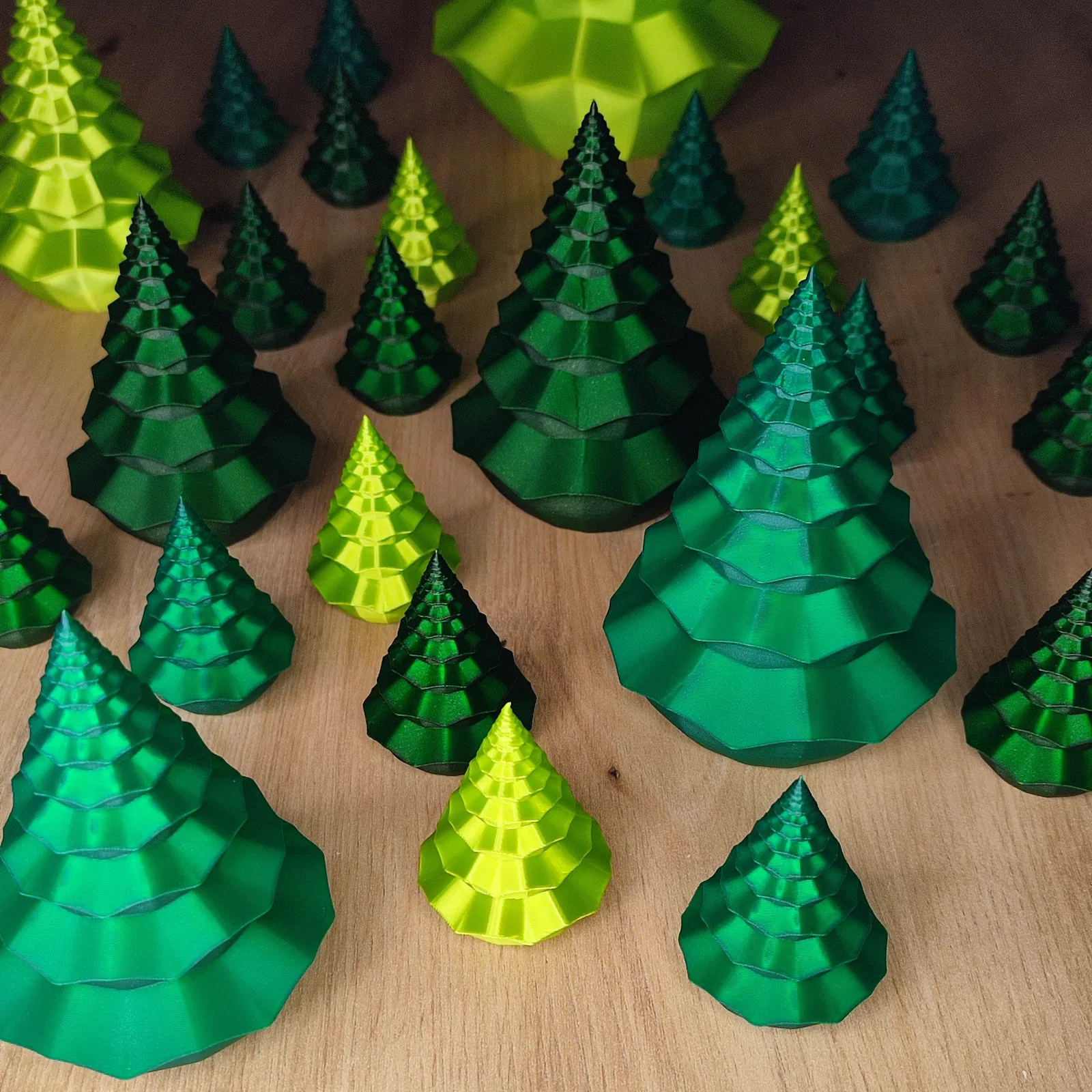 Các cây thông được hiển thị trong ảnh được in bằng PRUSAMENT PLA Opal Green, Blend Lime Green (màu xanh tươi) và Galaxy Green (có kim tuyến).