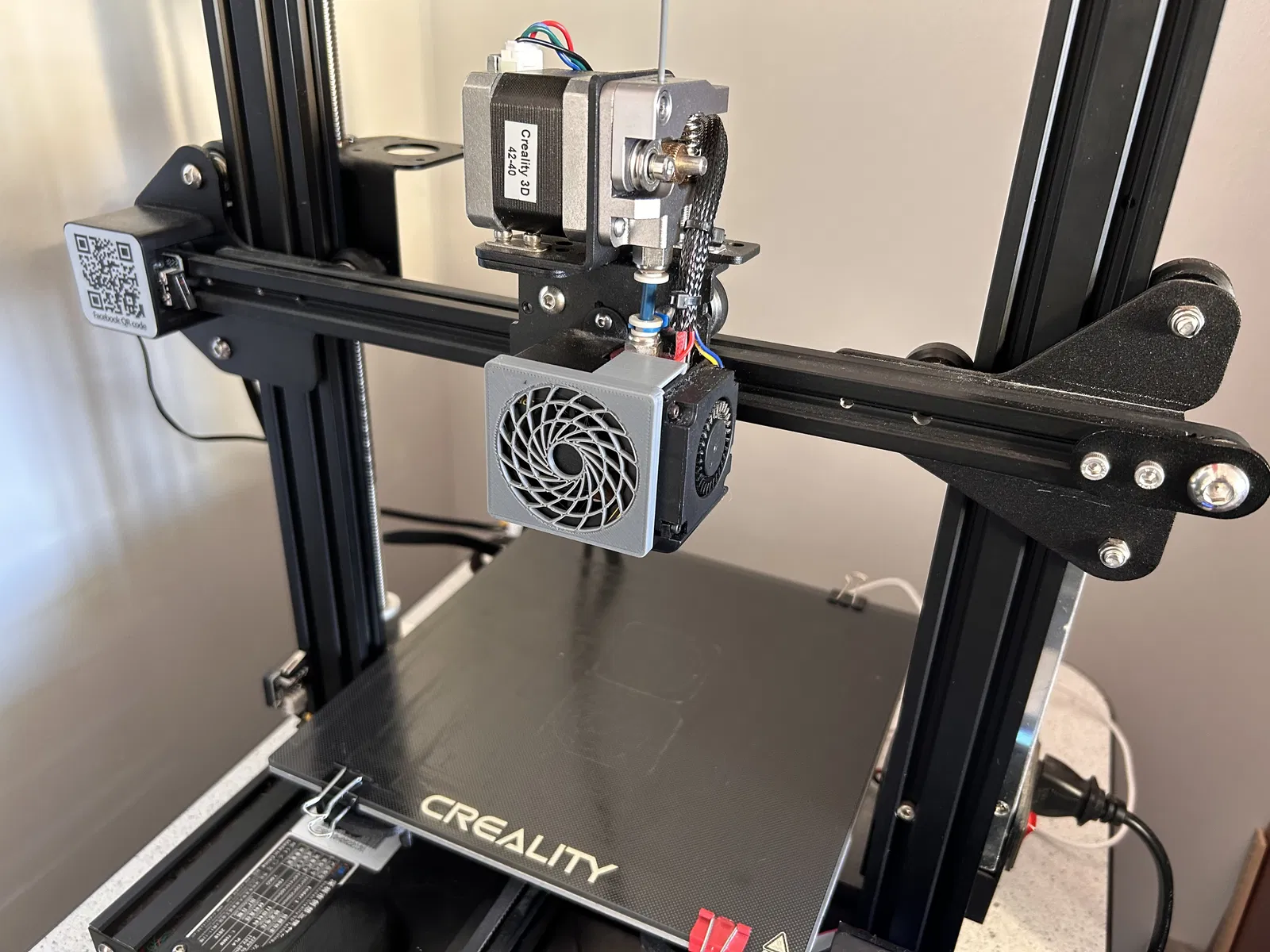 Cái lưới bảo vệ quạt zin của máy Ender 3 được chỉnh sửa lại để xài lưới bảo vệ giống loại "High-Efficiency" của Noctua. Về lý thuyết, cái này sẽ giúp giảm khoảng 2dB(A) tiếng ồn của quạt làm mát.
