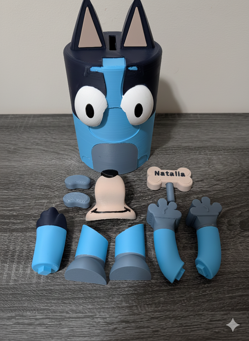 Đây là một dự án đặc biệt mình đã thiết kế: một heo đất đa sắc màu vui nhộn, lấy cảm hứng từ nhân vật Bluey nổi tiếng. Ban đầu mình tạo ra cái này cho cháu gái, và giờ mình chia sẻ cho cả cộng đồng cùng in. Thiết kế này tập trung vào việc lắp ráp dễ dàng và chất lượng in tuyệt vời mà không cần dùng đến AMS.