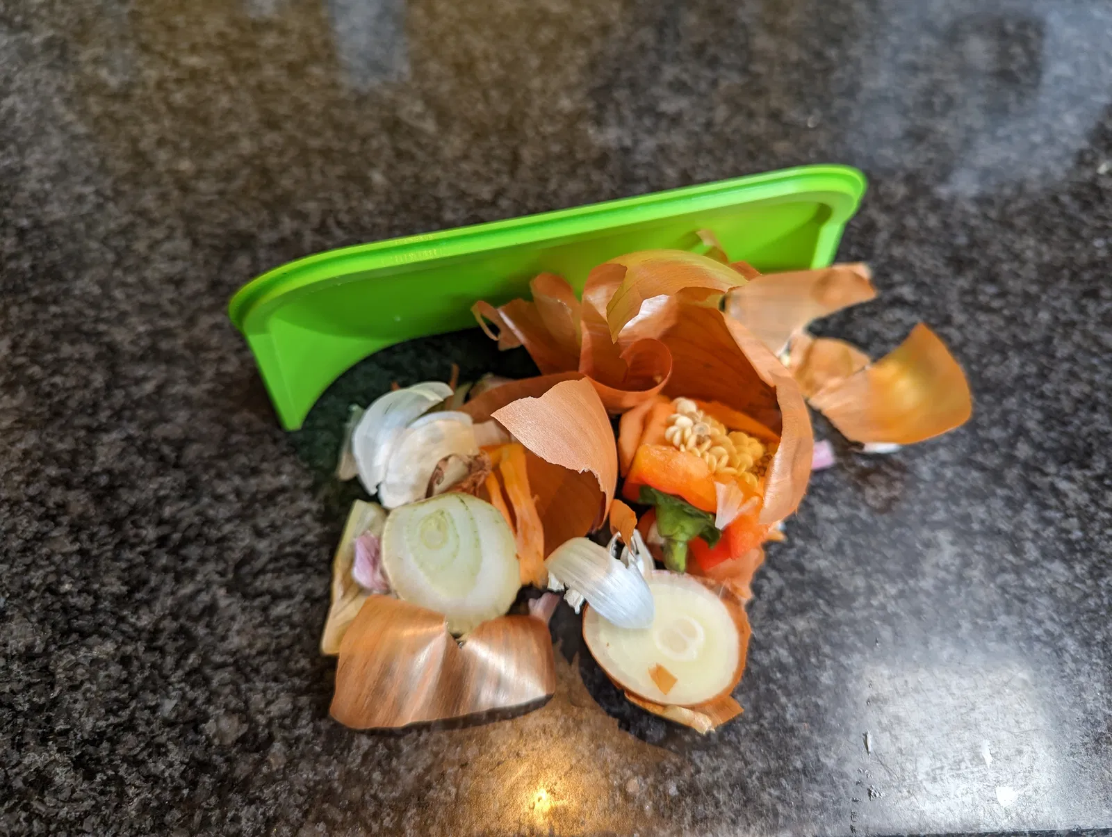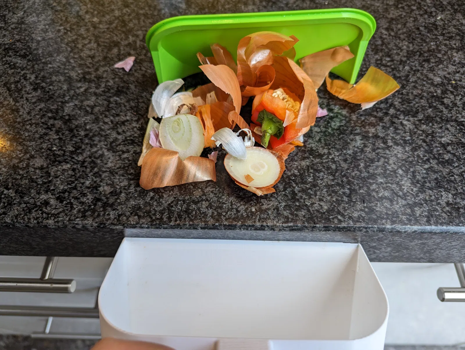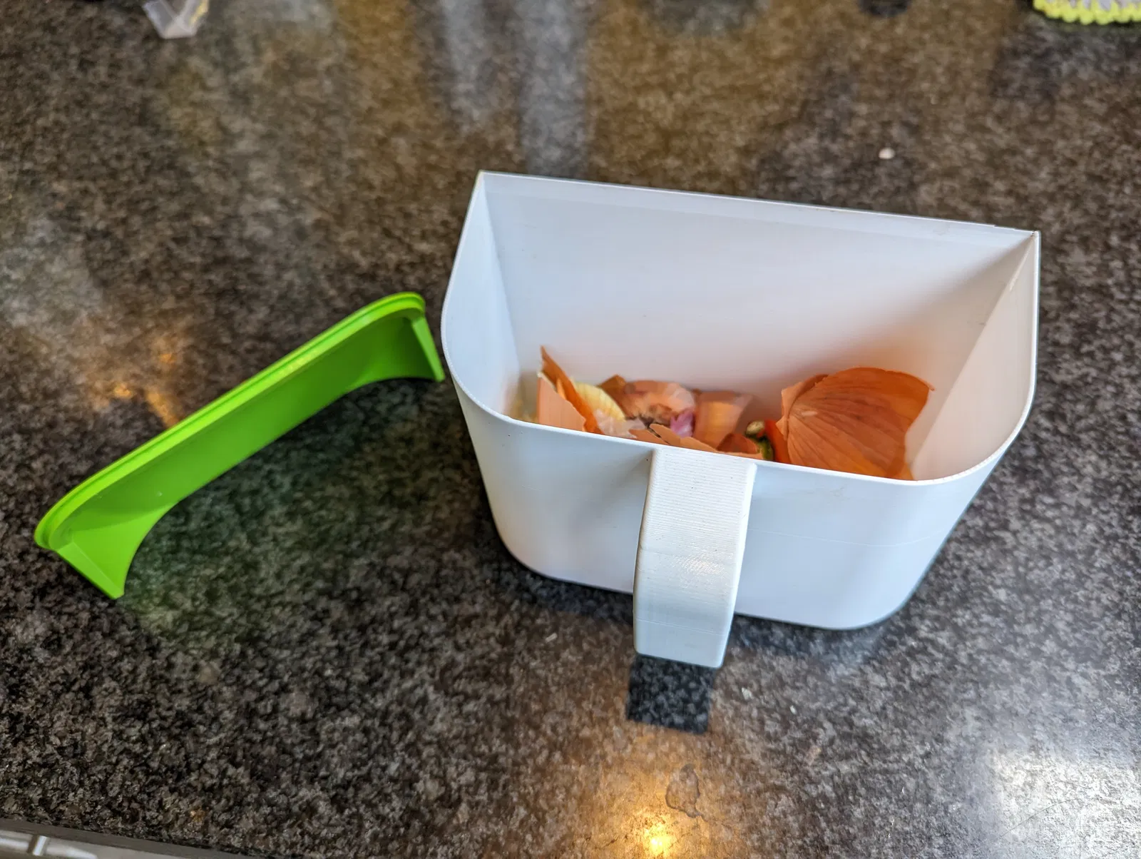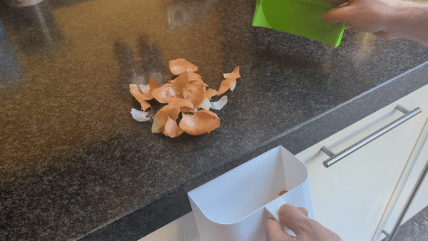 Một cái hũ nhỏ để dọn dẹp bàn bếp (nhà bếp) nè. Tui chủ yếu dùng nó để đựng vụn rau củ bỏ vô thùng ủ phân compost sau này. Bạn có thể quăng vỏ trái cây hay rau củ trực tiếp vào đây. Nhưng nếu bạn giống tui, mấy vụn này hay văng lung tung trên bàn bếp, thì cái nắp này có thể dùng để gom chúng lại và đẩy vô hũ cho gọn.