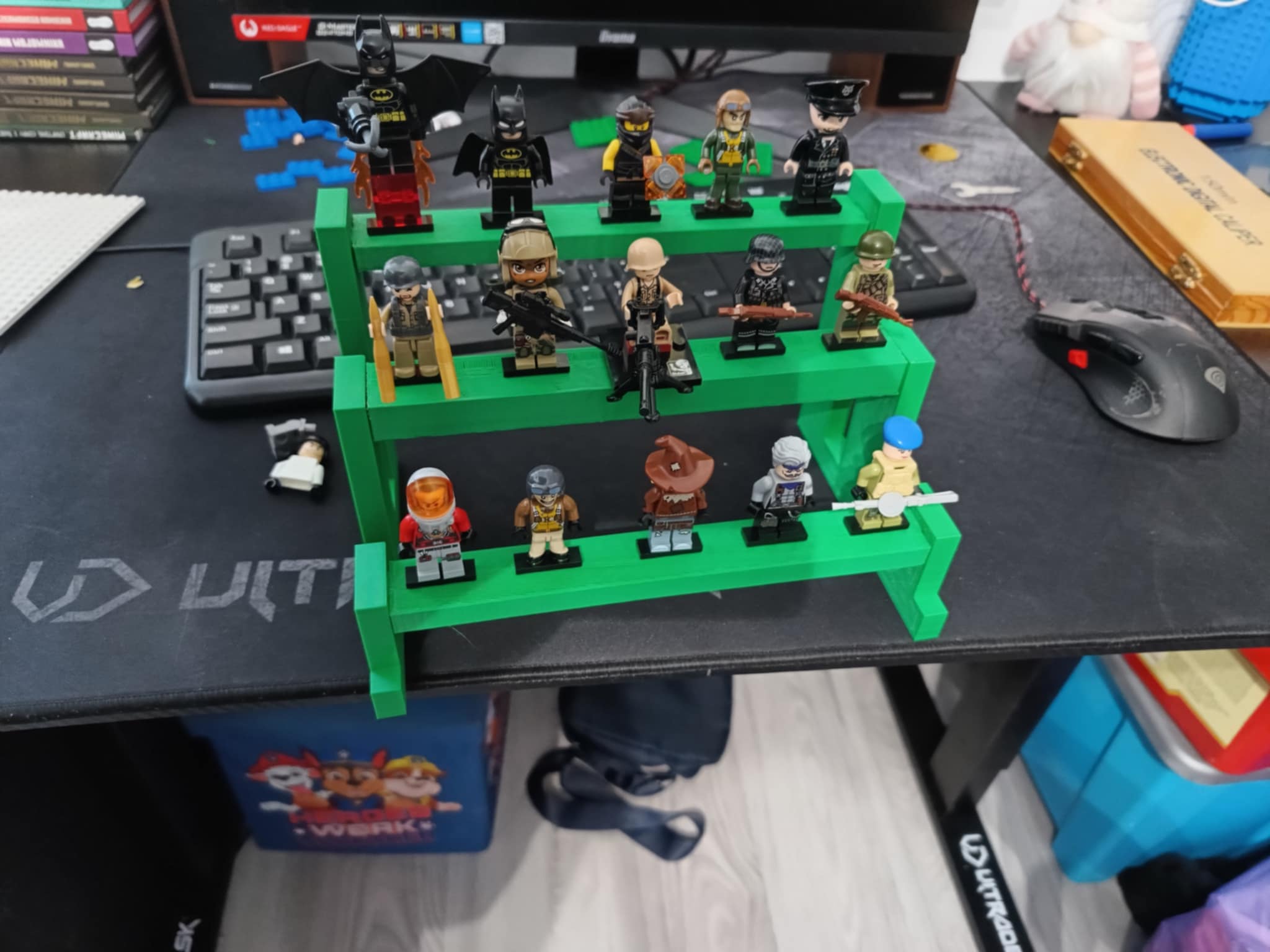 Chân đế LEGO minifigure 15 chỗ. Mẫu này cho phép bạn trưng bày nhiều mô hình LEGO cùng lúc. Bạn cần tải xuống hai phần 'Podstawka część 1' và ba phần 'Podstawka część 2' để hoàn thiện.