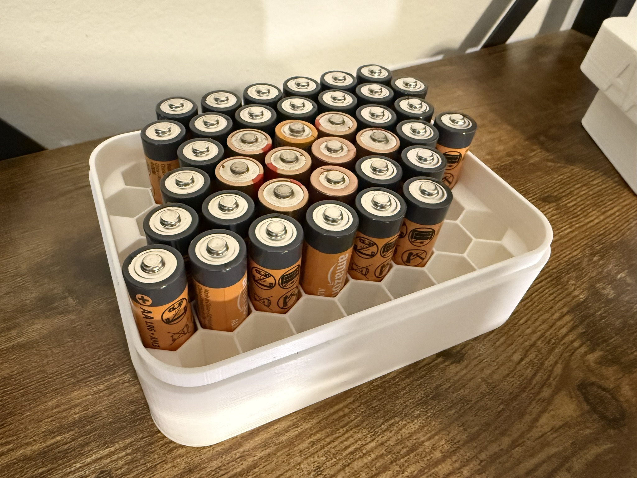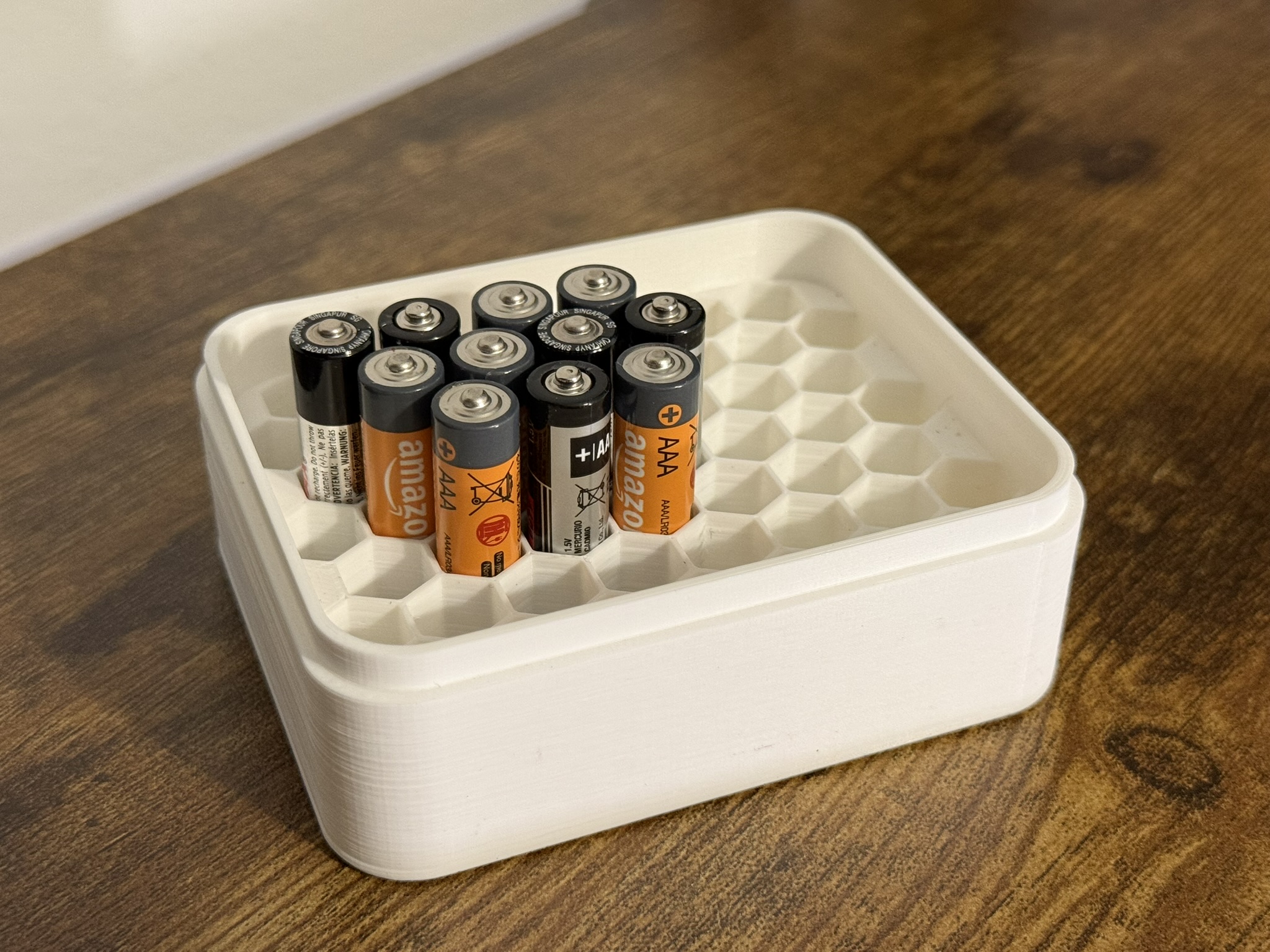 Thiết kế này kết hợp sự hiệu quả của hình lục giác (hình dạng yêu thích của tự nhiên) với tính thực tiễn của một giải pháp lưu trữ gọn gàng. Dù bạn trữ pin cho tay cầm chơi game, dụng cụ xưởng, hay đồ chơi của con nít, bạn sẽ luôn biết chính xác cục pin của mình nằm ở đâu.