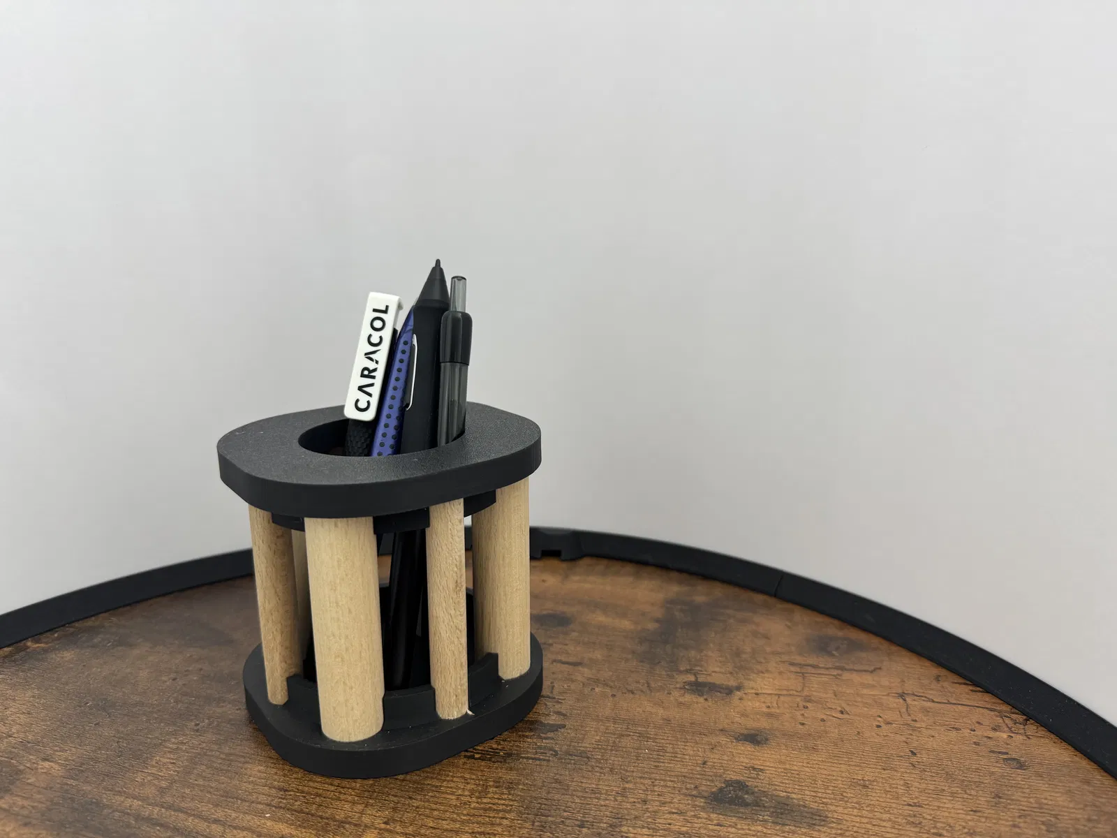 Chỗ cắm bút hiện đại lai giữa gỗ thật và chi tiết in 3D, tạo vẻ ngoài độc đáo với chốt gỗ. Dễ lắp ráp, hoàn hảo cho văn phòng và không gian sáng tạo.