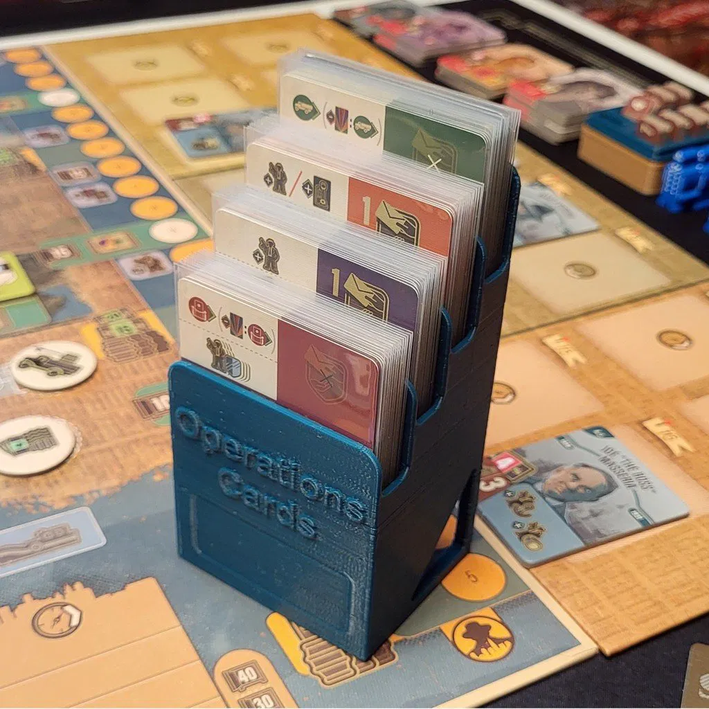Holder Bài Operations: Cái này giữ bốn bộ bài Operations ở vị trí đứng tiện lợi. Holder có thể đưa cho người chơi vào cuối lượt để họ chọn bài Operations trong khi người chơi tiếp theo bắt đầu lượt của họ. Các bộ bài được xếp chồng lên nhau theo chiều dọc để số ảnh hưởng và hành động đặc biệt của mỗi lá bài đều có thể nhìn thấy rõ ràng. Holder được cất trong hộp game cùng với các lá bài để chuẩn bị tiện lợi.