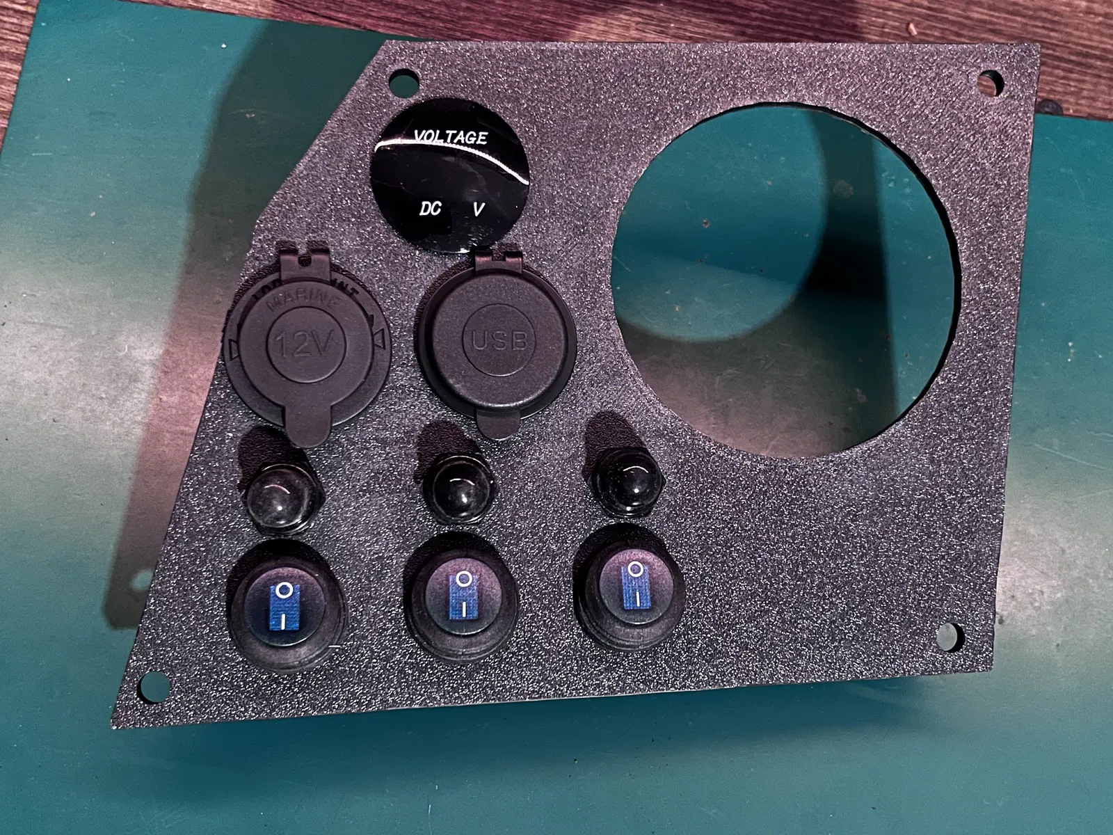 Cái dashboard này tui làm cho cái thuyền của tui đó. Chắc cũng hổng có xài được nhiều đâu NHƯNG mà mấy cái lỗ khoét thì nó vừa khít với mấy cái nút gạt loại xài cho tàu thuyền, cầu dao, với cái ổ châm thuốc/USB/vôn kế mà tui có sẵn. Mấy cái lỗ này nó y chang mấy cái bảng điều khiển đa năng mà tui mua trên Amazon đó. Để xài với mấy cái công tắc rocker 3 chân đó nha, nó nằm ở khoảng cách chuẩn đó.