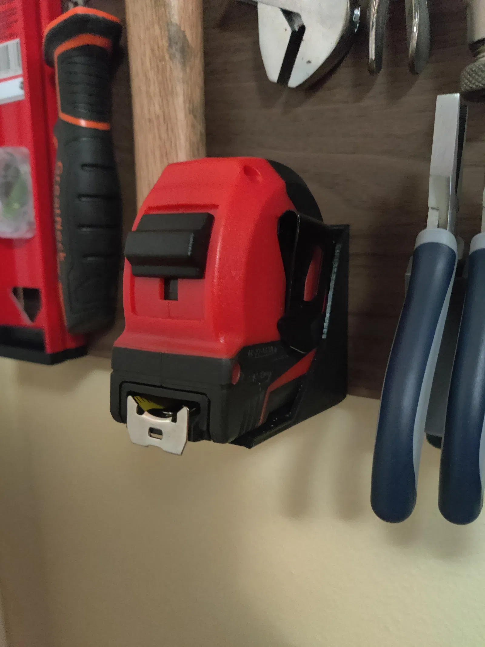 Khuôn gắn tường bằng vít cho cây thước dây Milwaukee 30 feet. In ở hai bên cho chắc, bỏ tree supports ở dầm mỏng, dùng vít gỗ #4.