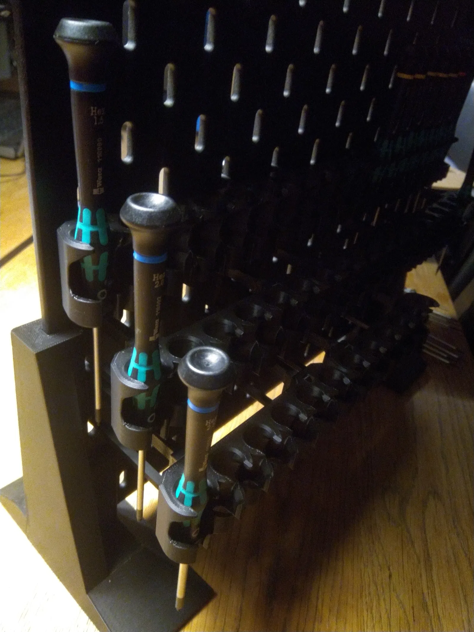 Tui cũng làm chúng dày hơn để chúng ép chặt vào cái đế giữ tua vít, nên nó sẽ không bị nhấc lên/nghiêng đi khi một cái tua vít nào đó mắc vào cạnh của đế giữ.