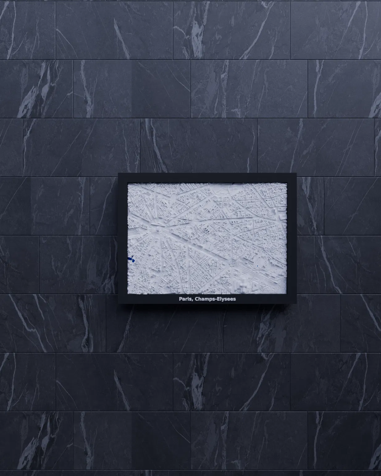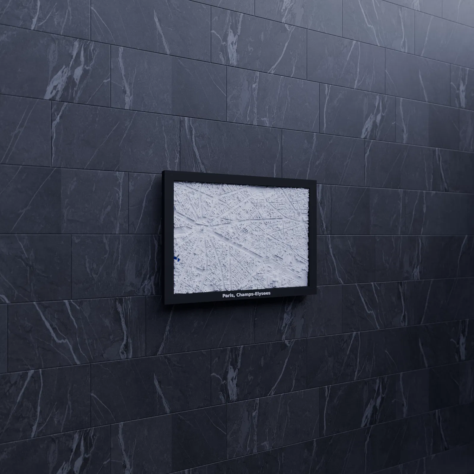 Mô hình địa hình thu nhỏ 3D Paris, Champs-Elysees, Pháp. Mô hình này thể hiện cảnh quan thành phố với kích thước 170,5 mm x 119,5 mm, lý tưởng cho mục đích giáo dục hoặc trang trí. Bao gồm các tùy chọn khung và cài đặt in được đề xuất.