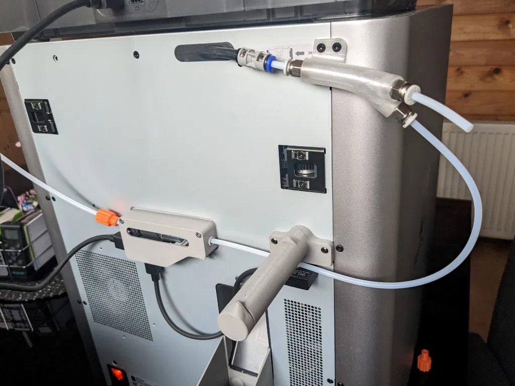 Một bộ chia như đã giới thiệu ở đây, nhưng không dùng nam châm, mà dùng ốc M3 gắn vào các ren có sẵn. Nó có hai phiên bản. Một phiên bản phẳng và một phiên bản cánh tay xoay 90° về phía cuộn dây, để có thể lấy sợi filament tốt hơn ở đây. Ở đầu vào máy in, tôi đã dùng dao nhọn để làm rộng nhẹ ống PTFE theo hướng AMS nhằm cải thiện đầu vào. Ốc M3 hiện có cần được thay thế bằng ốc dài hơn.