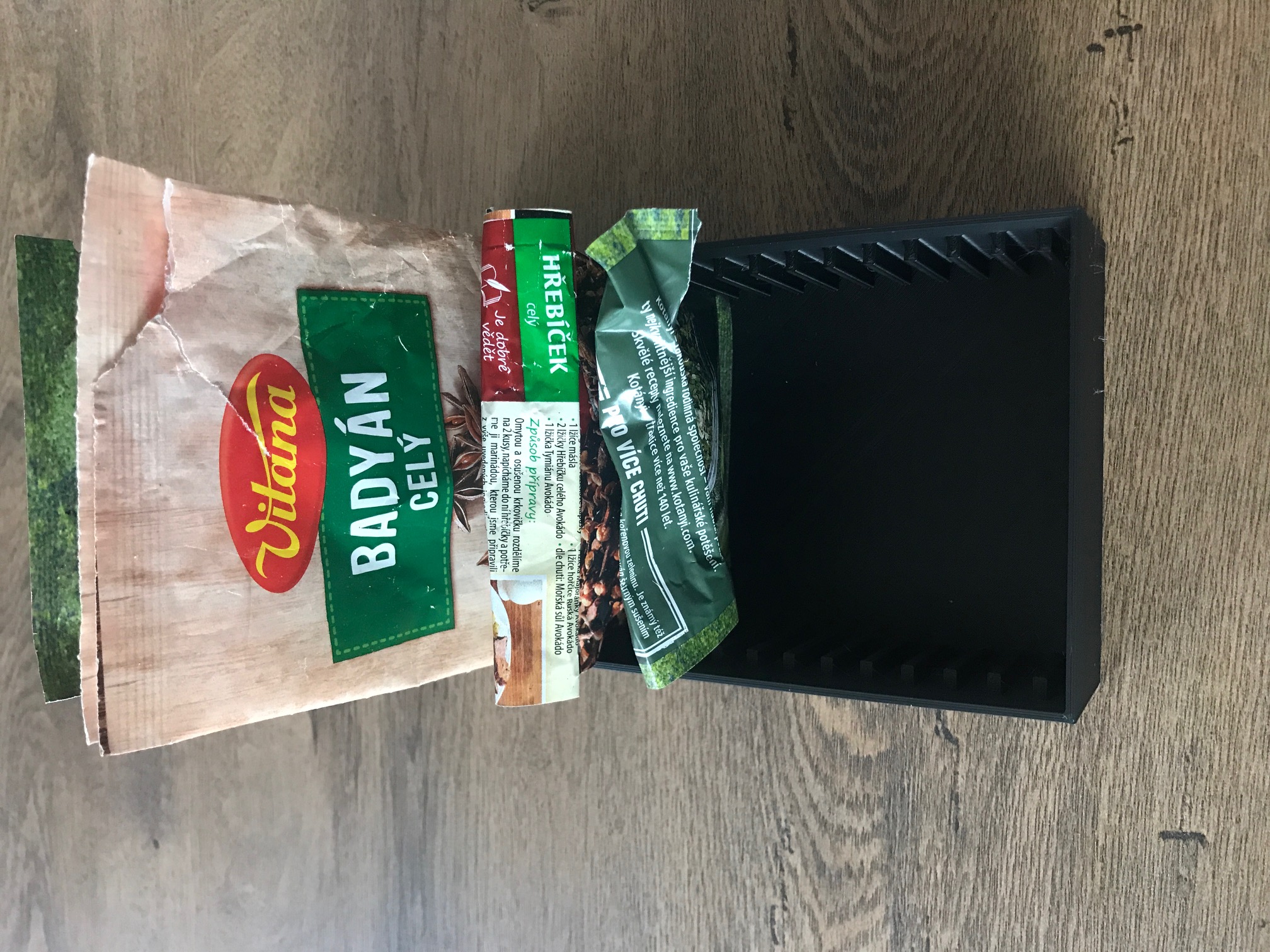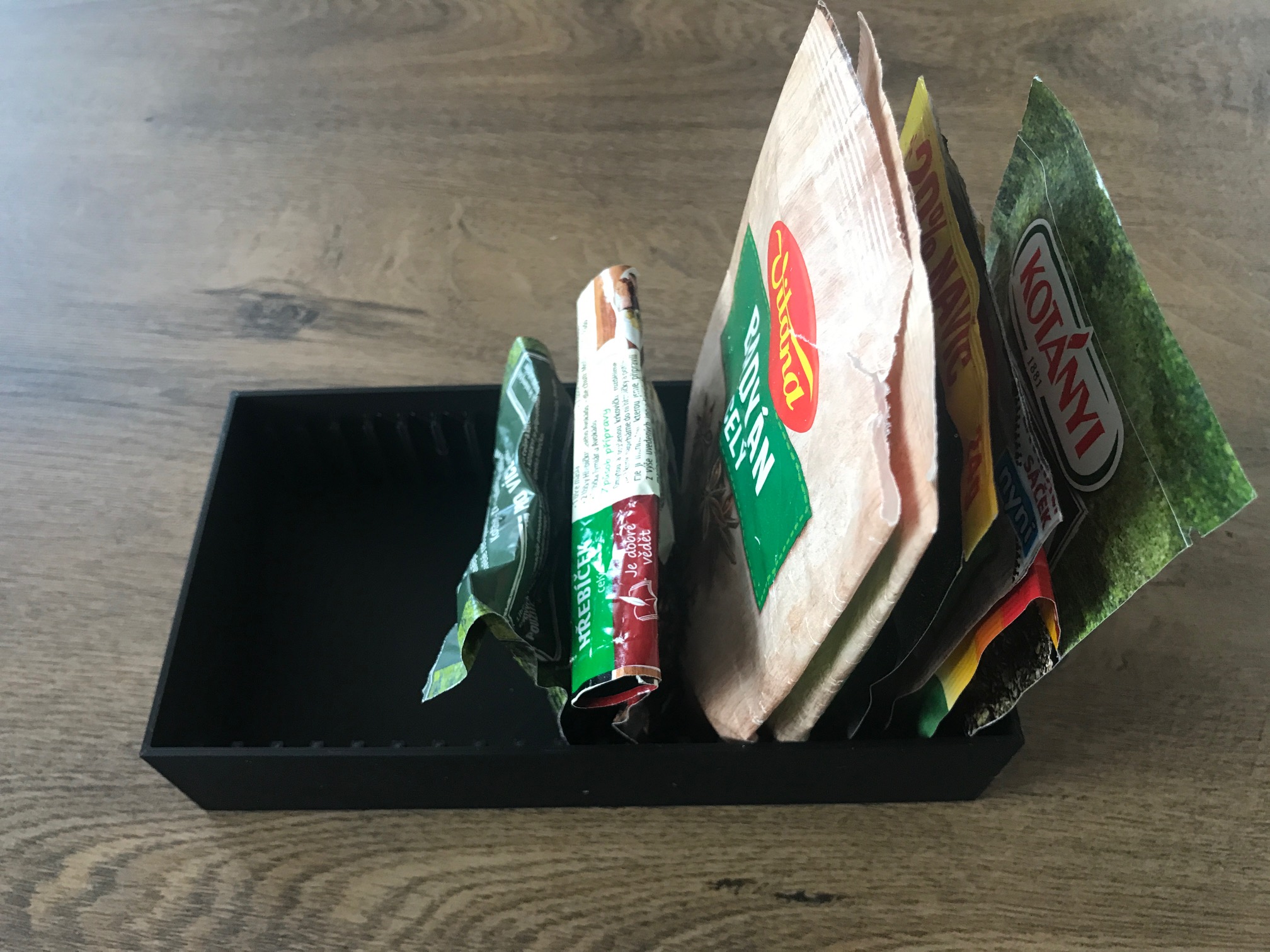 Một cái hộp đựng túi gia vị đơn giản, giúp gia vị không còn vương vãi. Chứa được 21 túi. Kích thước 106 x 200 x 43 mm.