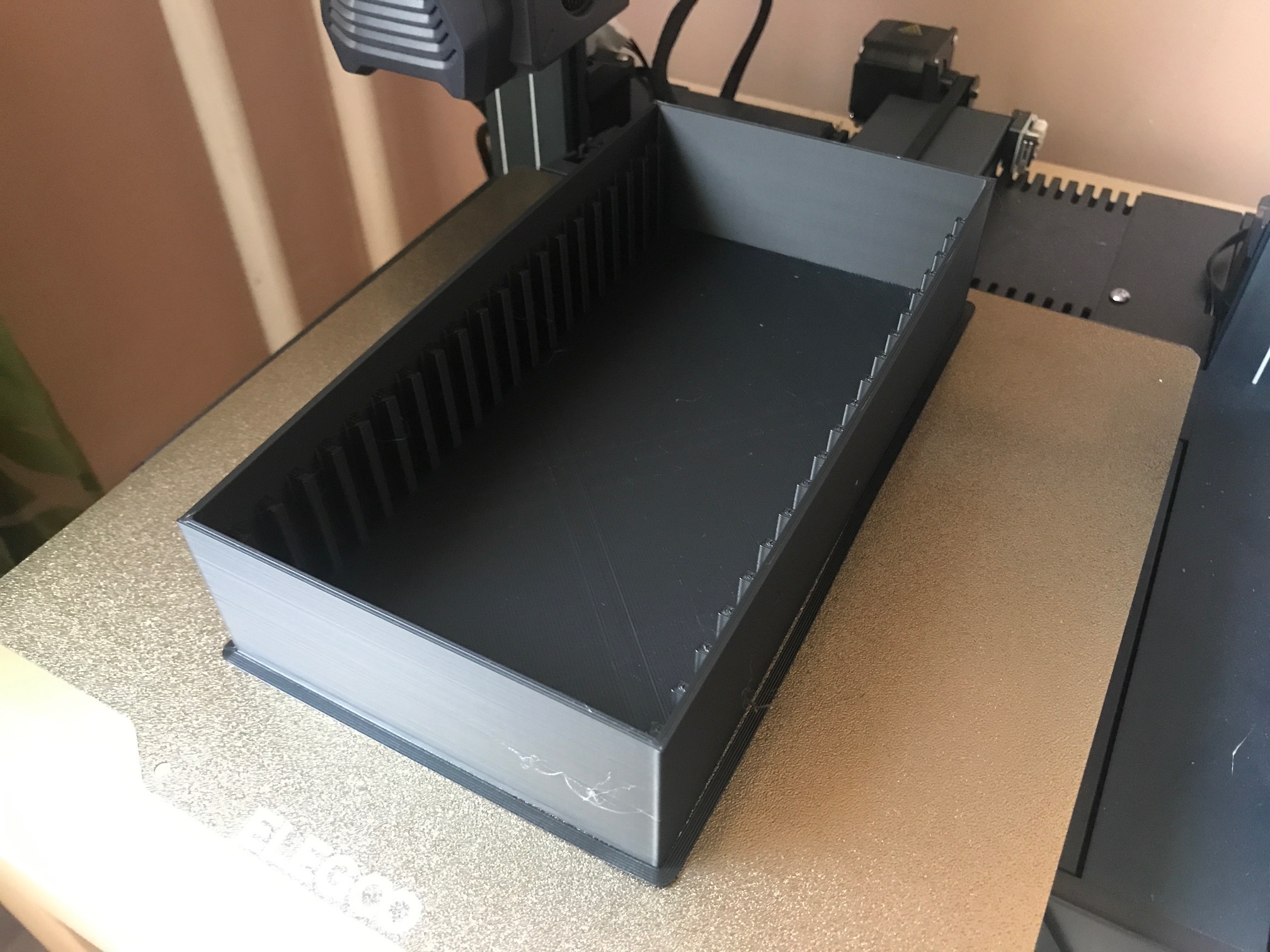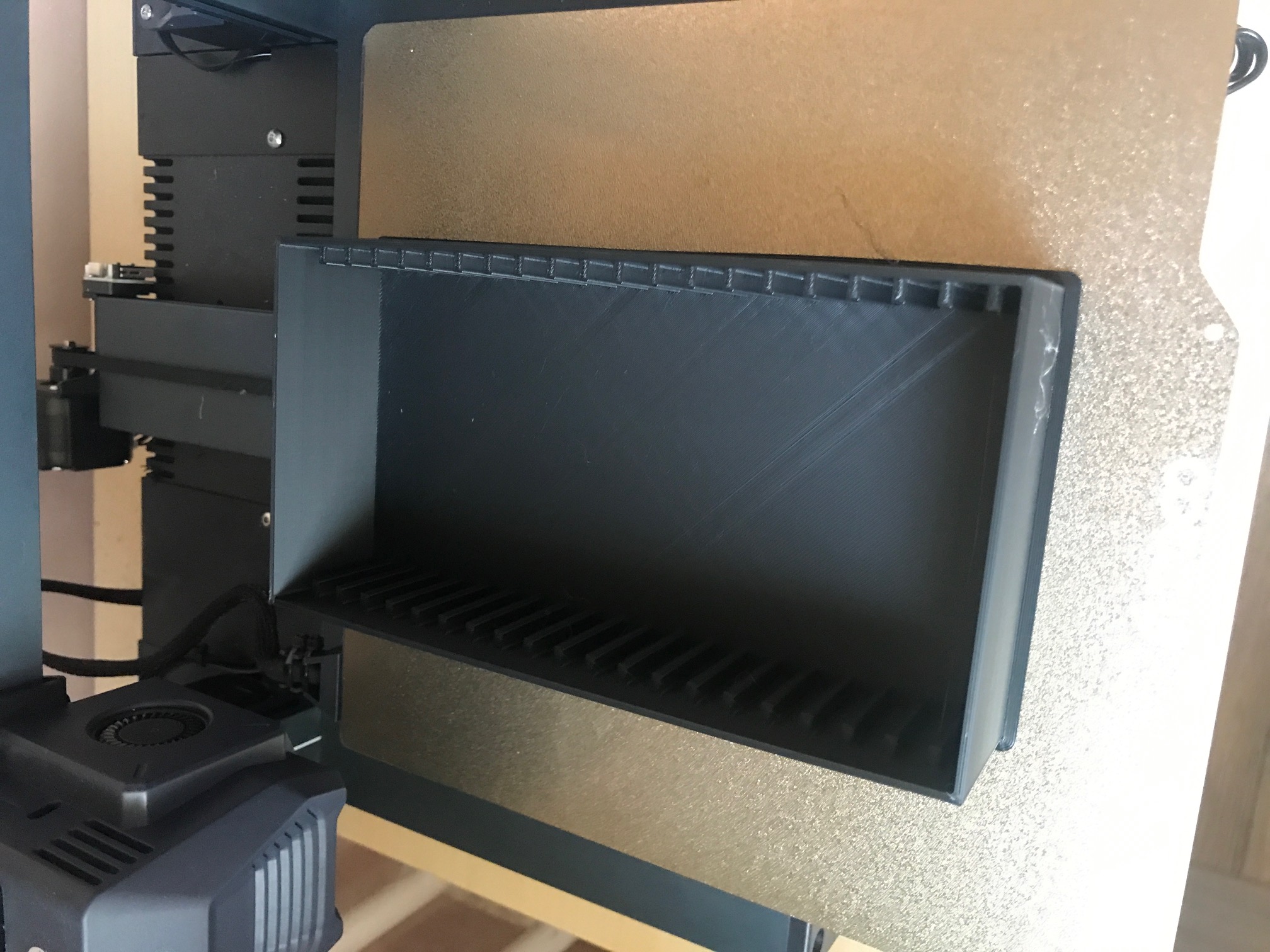 106 x 200 x 43 mm. In 0.3 mm, in PLA. No supports needed, but use brim. In 5h 21m, it uses 124g of filament.