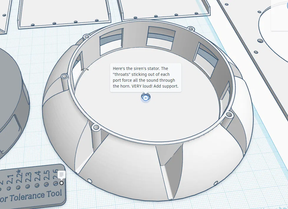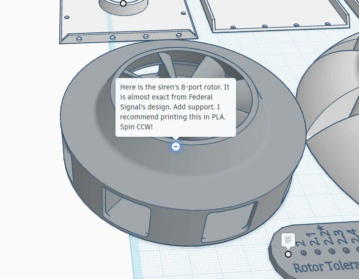 Mô hình này sử dụng động cơ 500TB với trục 2-2.6mm nhưng kích thước trục mặc định là 2.2mm. Rôto quay ngược chiều kim đồng hồ (CCW). Miles khuyên nên in rôto và stato có hỗ trợ, in rôto bằng PLA/PLA+ hoặc bất kỳ sợi nhựa nào bạn thích nhưng PLA được khuyến khích. Sử dụng brim cho phần còi và in CHẬM. Do trọng lượng của còi, phần đế một mình không thể đỡ được. Hãy cân nhắc gắn nó vào một đế lớn bằng gỗ hoặc thứ gì đó tương tự.