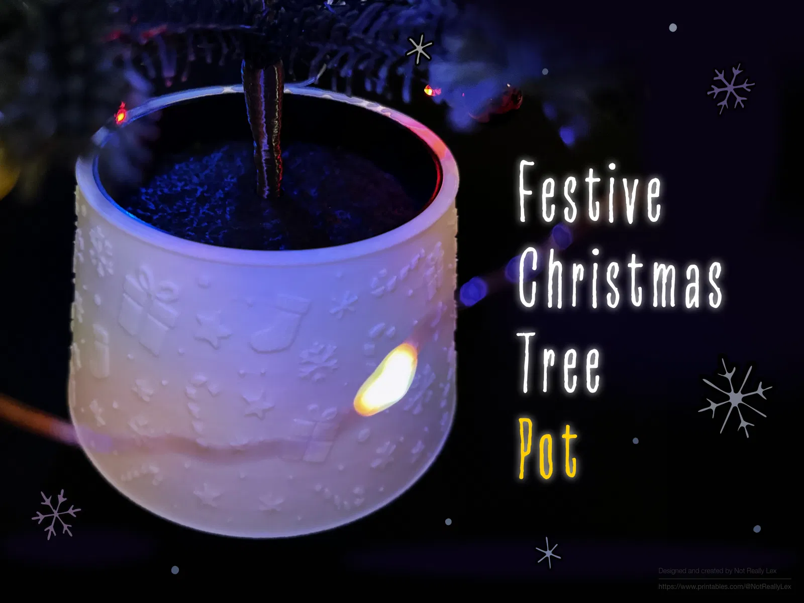 Chậu cây thông Noel tối giản, lấy cảm hứng từ Bắc Âu, dành riêng cho cây IKEA VINTERFINT (chậu 12cm). Đế vững chãi, có chỗ giấu hộp pin đèn. Phiên bản lễ hội với họa tiết giáng sinh dập nổi như hộp quà, kẹo que, ngôi sao, bông tuyết. In một màu hoặc đa màu sắc để thêm phần rực rỡ.
