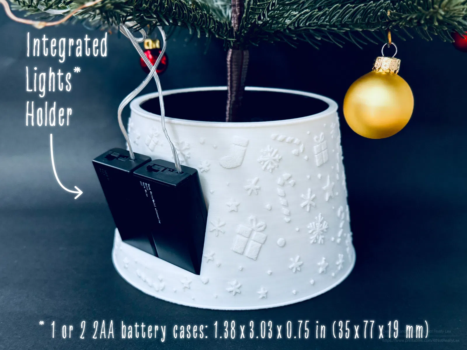 Cái đế rộng hơn, vững chãi giải quyết vấn đề đổ ngã, và tui đã thêm 2 phiên bản có giá đỡ tích hợp cho hộp pin đèn Giáng sinh, có kích thước cho hộp pin 2AA tiêu chuẩn 1.38 x 3.03 x 0.75 inch (35 x 77 x 19 mm), để mọi thứ gọn gàng và được giấu kín. Không còn những cục pin rơi nữa!