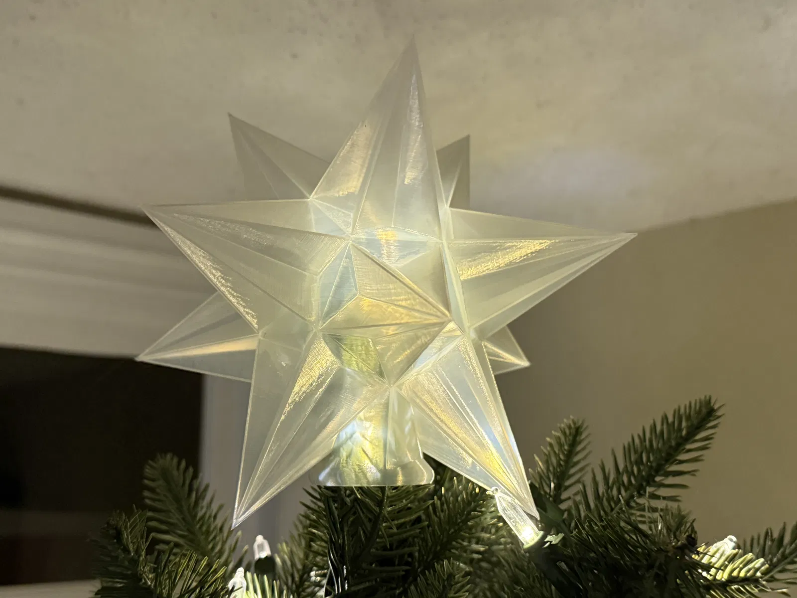Ngôi sao 10 cánh này được in thành nhiều mảnh rồi dán lại với nhau. Bạn có thể in ở chế độ vase mode để ngôi sao trong hơn, hoặc in tiêu chuẩn đều được. Phần đế là hình đa diện 12 mặt có mặt bích dài, các đỉnh ngôi sao sẽ được dán vào.