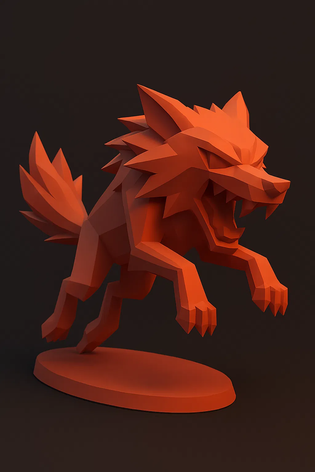 Bức tượng 3D đầy năng động này tái hiện hình ảnh một con sói hung dữ, được phóng đại theo phong cách hoạt hình, đang ở giữa cú nhảy, bất động trên một bệ đỡ mượt mà. Được tạo ra hoàn toàn cho in 3D, các chi góc cạnh, túm lông lởm chởm và các đặc điểm hình học sắc nét của con sói gợi lên năng lượng thô và sự hung hăng cách điệu. Miệng nó mở rộng trong tiếng gầm gừ, để lộ hàm răng hình tam giác và chiếc lưỡi vuông vức, trong khi đôi mắt sáng rực và đôi tai nhọn tăng thêm vẻ mãnh liệt cho sinh vật. Tư thế — chân trước duỗi thẳng, chân sau co lại, đuôi xòe ra — gợi ý một cú vồ mạnh mẽ, làm cho nó trở nên lý tưởng cho việc trưng bày 3D đầy ấn tượng.