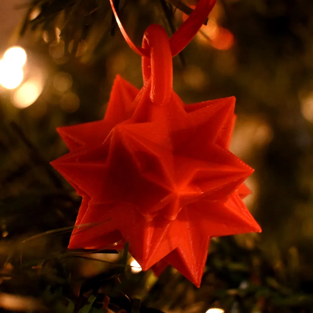 Trang trí cây thông Noel độc đáo lấy cảm hứng từ các Hợp chất Đa Diện Đều. Mô hình được cung cấp nguyên khối hoặc tách đôi tiện lợi cho việc in 3D, với một số tùy chọn đặc biệt giúp giảm thiểu việc chống đỡ. Thiết kế bằng Haskell với Waterfall-CAD.