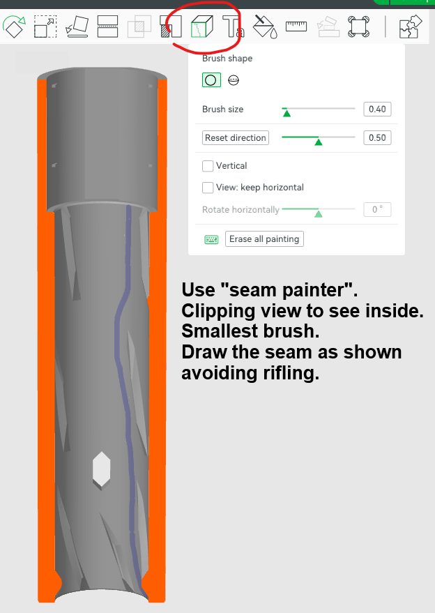 Chỉ cần in ra. Nó được thiết kế để dễ dàng nên mọi cài đặt đều hoạt động. Điểm đặc biệt duy nhất để in các rãnh xoắn tối ưu là bạn cần sử dụng Seam Painter để vẽ đường nối bên trong nòng sao cho tránh các gờ rãnh xoắn (xem hình) để đảm bảo không có bavia đường nối nơi rãnh xoắn gặp bọt xốp.