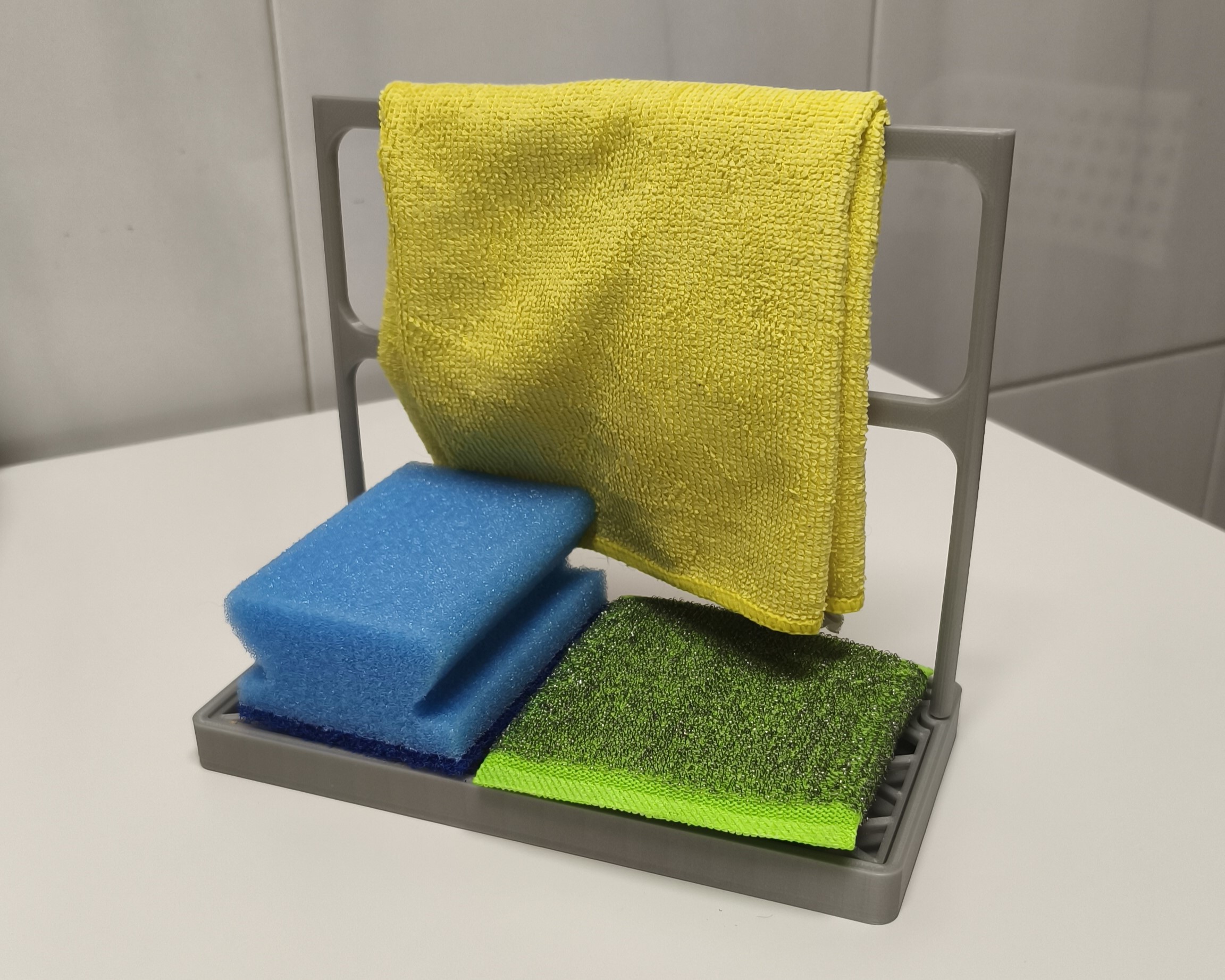 Lý tưởng để sử dụng bên cạnh bồn rửa chén, giá đỡ này giúp giảm sự tích tụ độ ẩm trong khi vẫn giữ cho mút rửa chén và khăn lau của bạn luôn trong tầm tay.