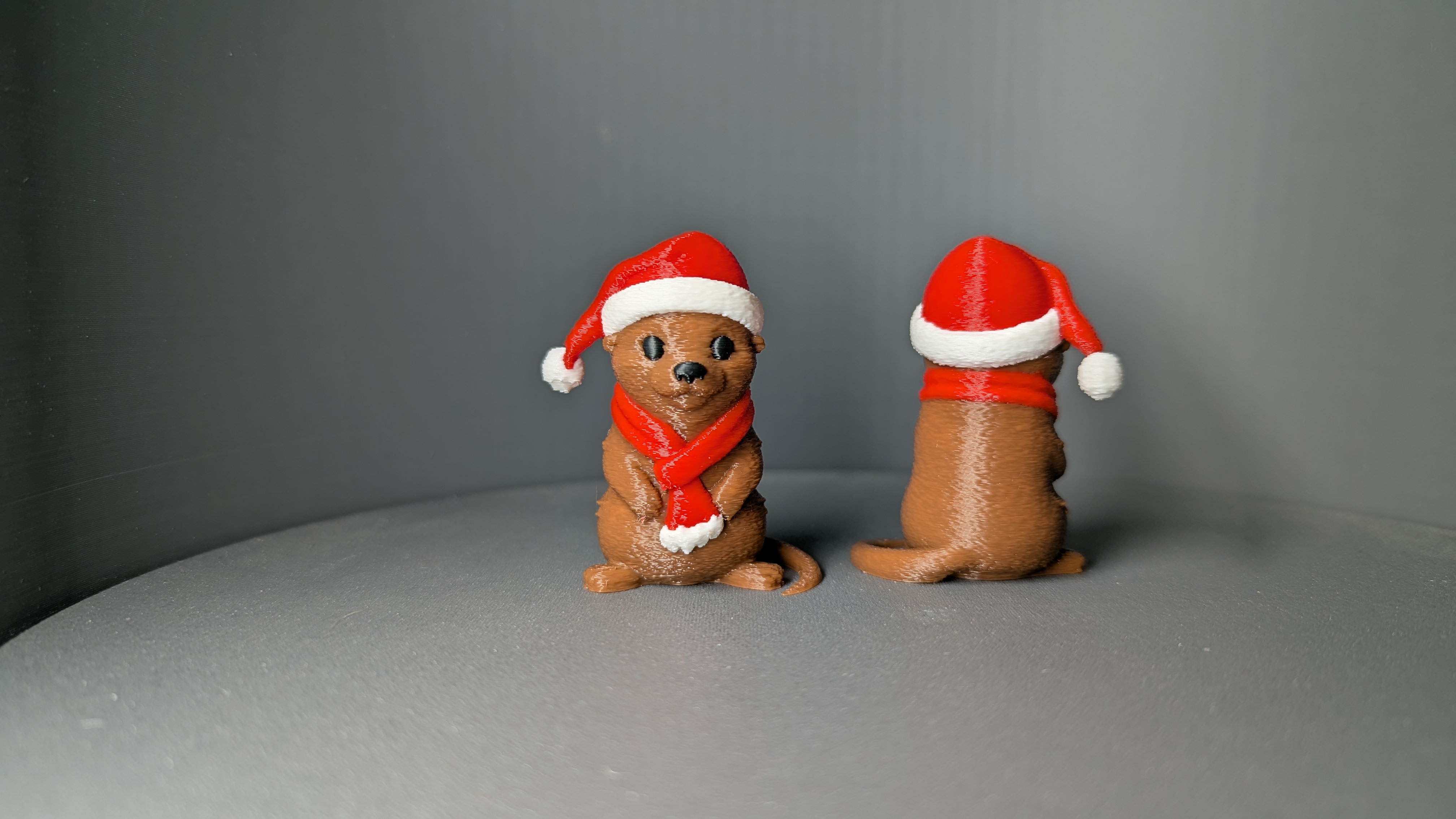Hôm nay tui có một chú rái cá Giáng sinh cao 50mm đây nè! Phiên bản nhiều màu sẽ tốn kha khá filament đó, tui đề nghị in vài con cùng lúc để đỡ phí nha. Còn có thể thêm một vật thể làm phẳng để giảm rác thải hơn nữa, giống như cái này nè: https://makerworld.com/en/models/1347930-honeycomb-fidget-vertical-flush-object