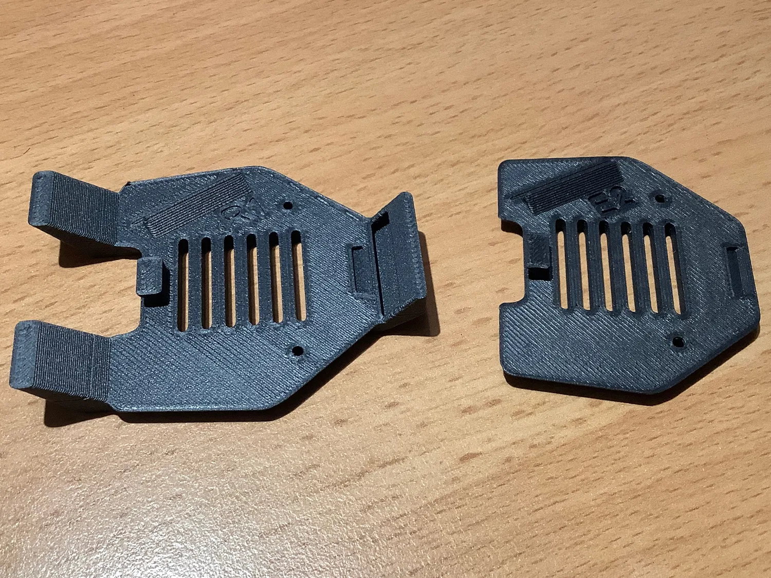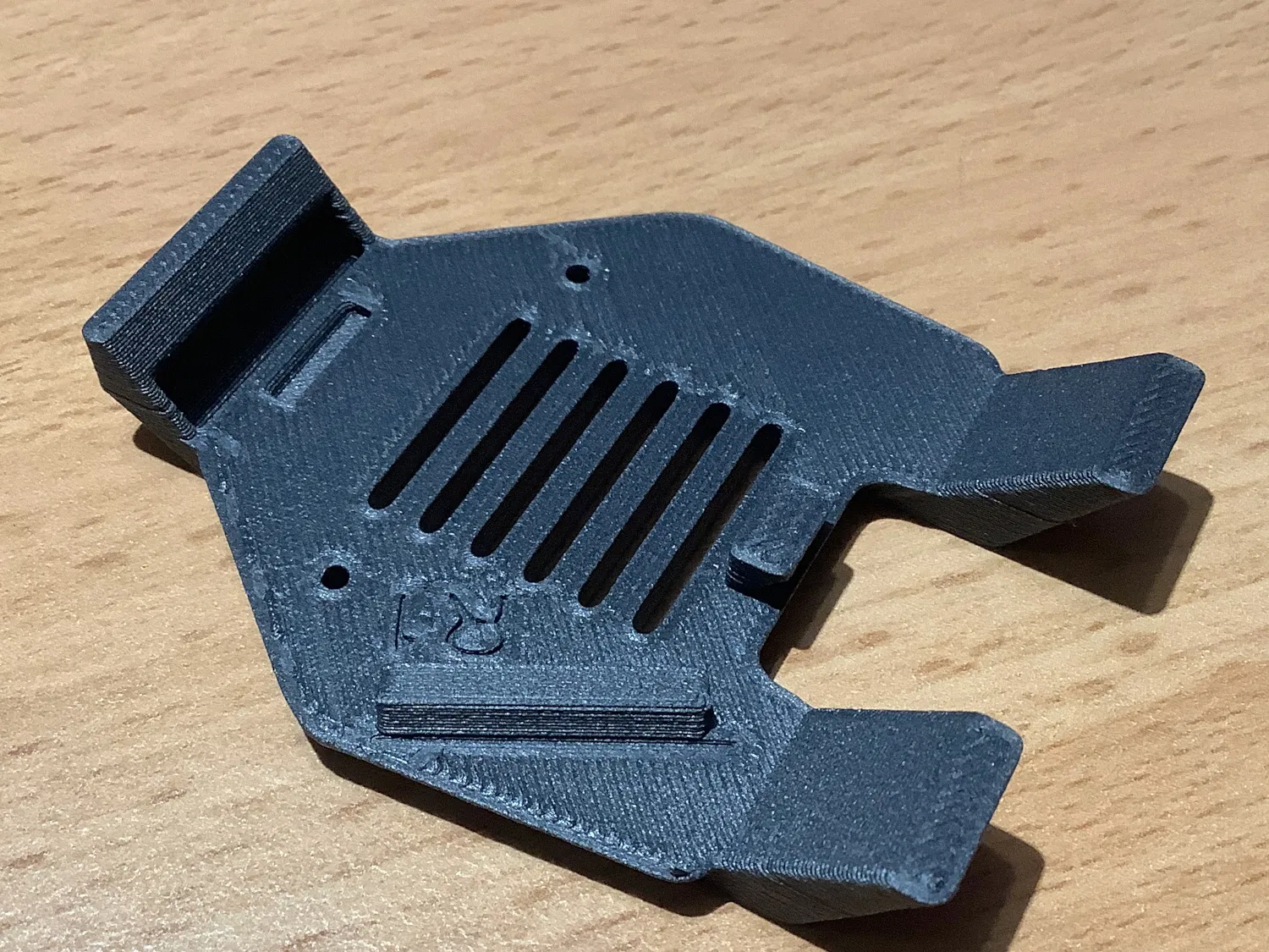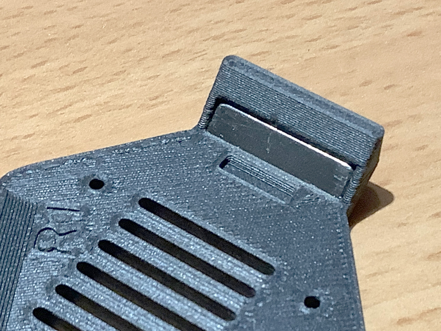 - Hai chỗ lõm cho nam châm tròn đường kính 10mm (dày 2mm đến 3mm) đã được thêm vào các 'cánh' phía trên để căn chỉnh giá đỡ camera với đỉnh khung máy in.