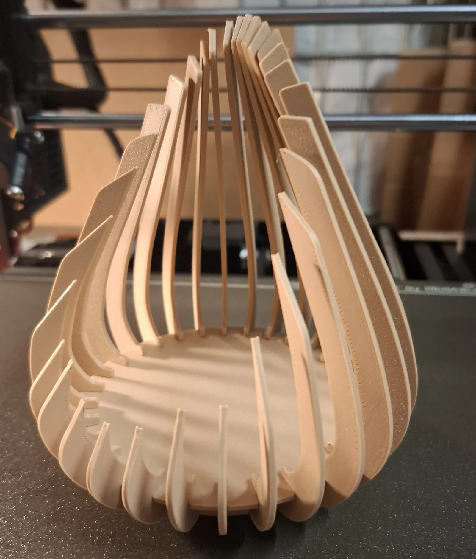Mình đã in cái chân nến này bằng PLA màu nâu sáng mờ, nhìn y như làm bằng gỗ vậy đó. Nó cao khoảng 13 cm và gồm 33 bộ phận. Sau khi in xong, chỉ cần ráp mấy bộ phận lại với nhau là dính chắc lắm luôn.